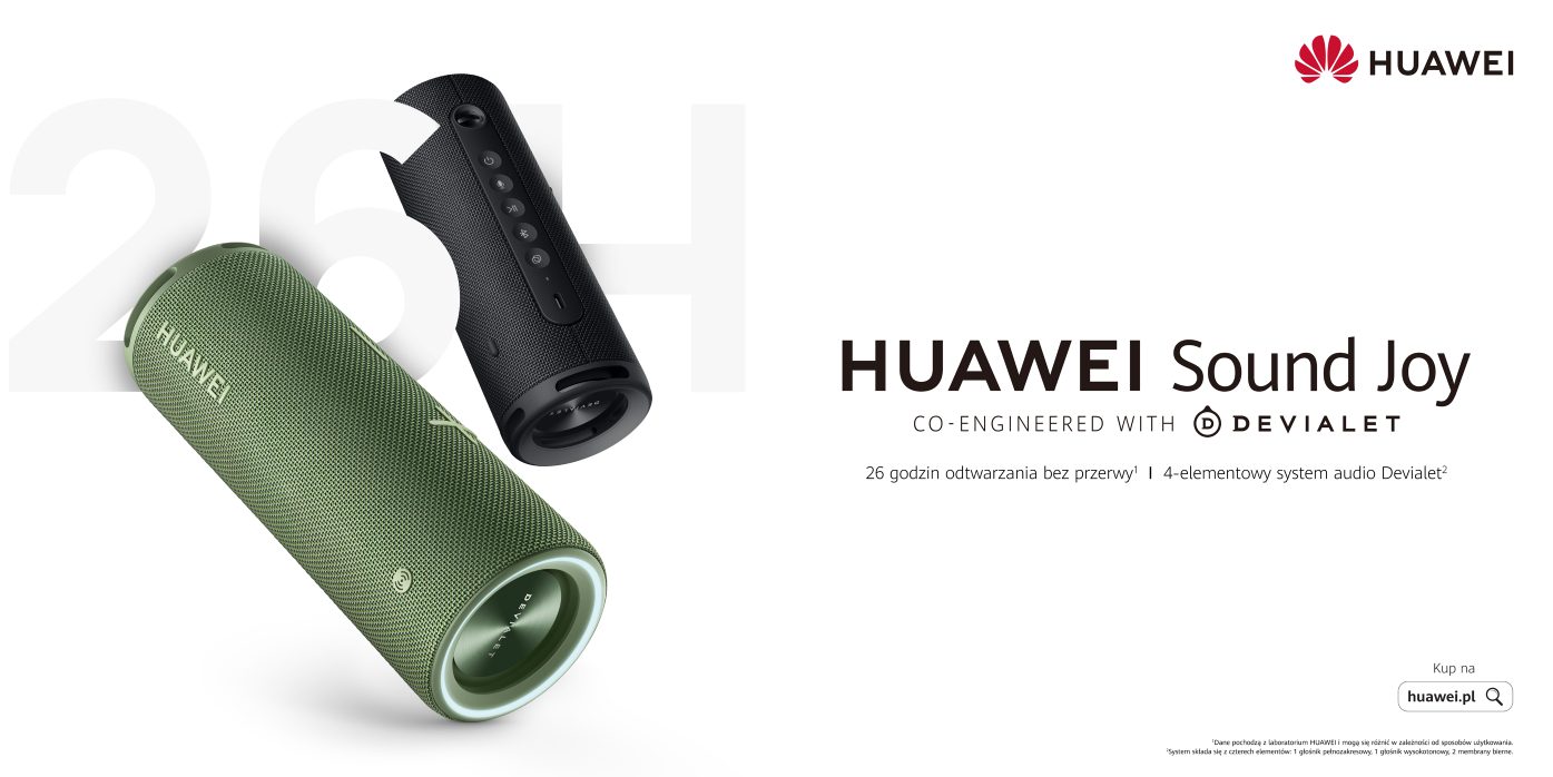Głośnik wyróżnia się długim czasem pracy na jednym ładowaniu, zapewniając aż 26 godzin odtwarzania bez przerwy oraz dwuzakresowym systemem akustycznym, który gwarantuje mocne basy oraz przejrzyste tony wysokie. Huawei Sound Joy dostępny jest w rekomendowanej cenie detalicznej 549 zł.
