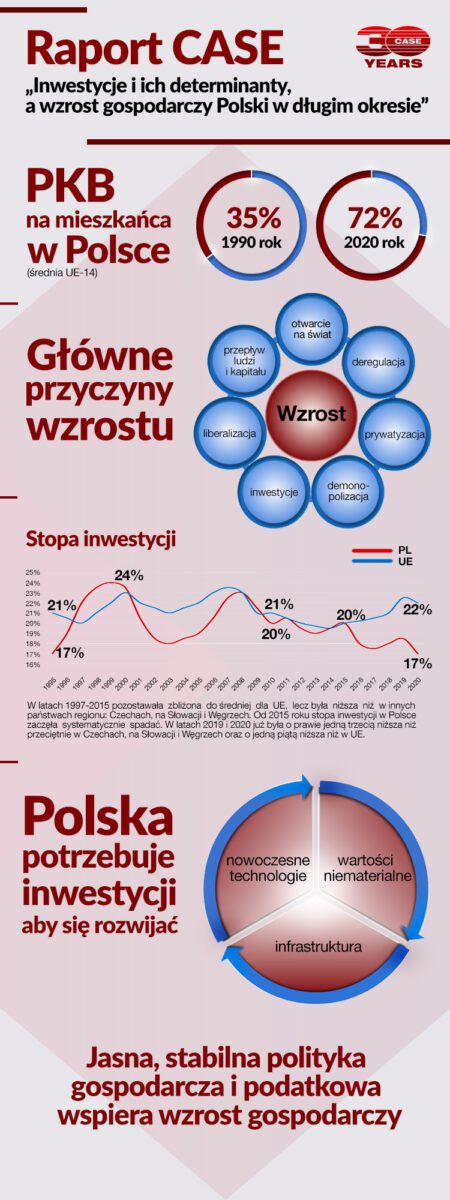 Z raportu „Inwestycje i ich determinanty, a wzrost gospodarczy Polski w długim okresie” wynika, że w 1990 roku PKB na mieszkańca w Polsce wynosił ok. 35 proc. tego wskaźnika dla krajów UE-14. W 2020 roku nasze PKB wynosiło już 71,8 proc. przeciętnego w UE-14 oraz 77 proc. w UE-27. Wzrost był m.in. efektem przyjęcia modelu gospodarczego, który polegał na liberalizacji, demonopolizacji, prywatyzacji i deregulacji gospodarki, a także znaczącego otwarcia na handel międzynarodowy, przepływy kapitału, siły roboczej i usług. Zmiany nastąpiły w okresie najbardziej intensywnej globalizacji, dzięki której w Polsce i pozostałych krajach regionu znalazły się segmenty międzynarodowych łańcuchów produkcji.