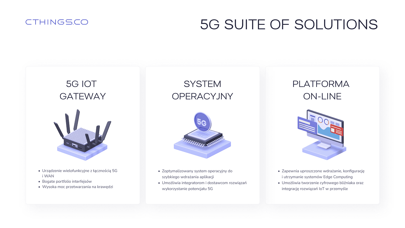 Odpowiadając na potrzeby branży przemysłowej, CTHINGS.CO opracował autorski system 5G Suite, złożony z routera przemysłowego 5G IOT Gateway, systemu operacyjnego do przetwarzania krawędziowego (edge computing) oraz platformy chmurowej Orchiestra. Według wyliczeń prezentowanych przez polsko-austriacki startup, wdrożenie systemu 5G Suite pozwala skrócić o 75% czas wdrożenia przemysłowego Internetu Rzeczy 5G oraz podnieść o 65% wydajność operacyjną. Dzięki tak wyraźnym korzyściom inwestycja w przemysłowy IoT 5G ma szansę zwrócić się w okresie do 3 miesięcy.