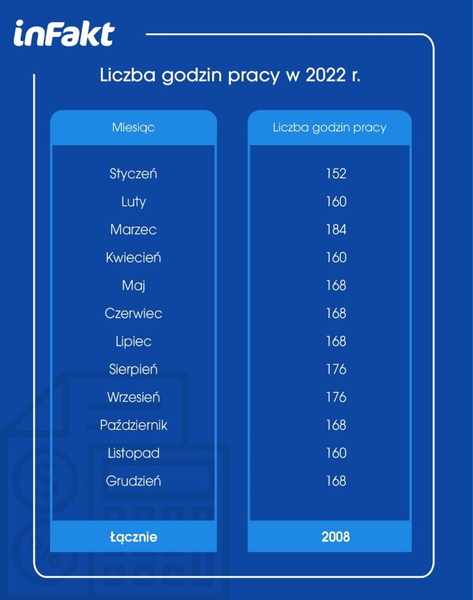 W przyszłym roku czas pracy na pełnym etacie wyniesie łącznie 2008 godzin. Najbardziej pracowitym miesiącem będzie marzec – 23 dni pracujące, czyli 184 godziny. Z kolei najwięcej wolnych dni (12) wypadnie w styczniu. Różnica względem marca wyniesie więc aż 32 godzin.