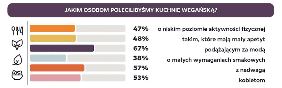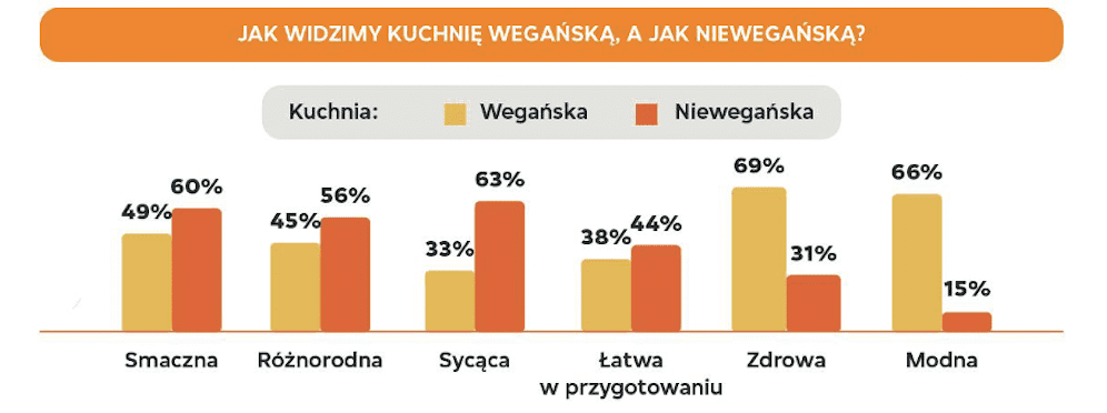 Zgodnie z wynikami badania “Polacy o kuchni wegańskiej 2022”, panuje przekonanie, że kuchnia wegańska jest zdrowsza i bardziej modna niż niewegańska, ustępuje jej jednak pod względem smaku, różnorodności, łatwości przygotowania czy zaspokajania apetytu. Polacy poleciliby ją przede wszystkim kobietom oraz osobom o niskim poziomie aktywności fizycznej, o niewielkim apetycie, podążającym za modą, o małych wymaganiach smakowych oraz z nadwagą.