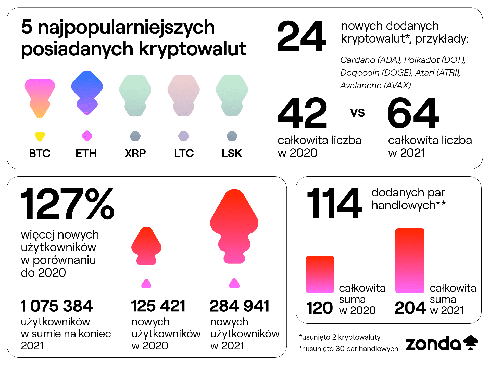 Na wzroście popularności branży skorzystała również platforma Zonda, która zakończyła rok z ponad milionem zarejestrowanych inwestorów, w tym 127 proc. wzrostem liczby nowych użytkowników rok do roku. Wśród kryptowalut najczęściej posiadanych przez klientów Zondy znalazły się: Bitcoin (BTC), Ethereum (ETH), Ripple (XRP), Litecoin (LTC) oraz Lisk (LSK).