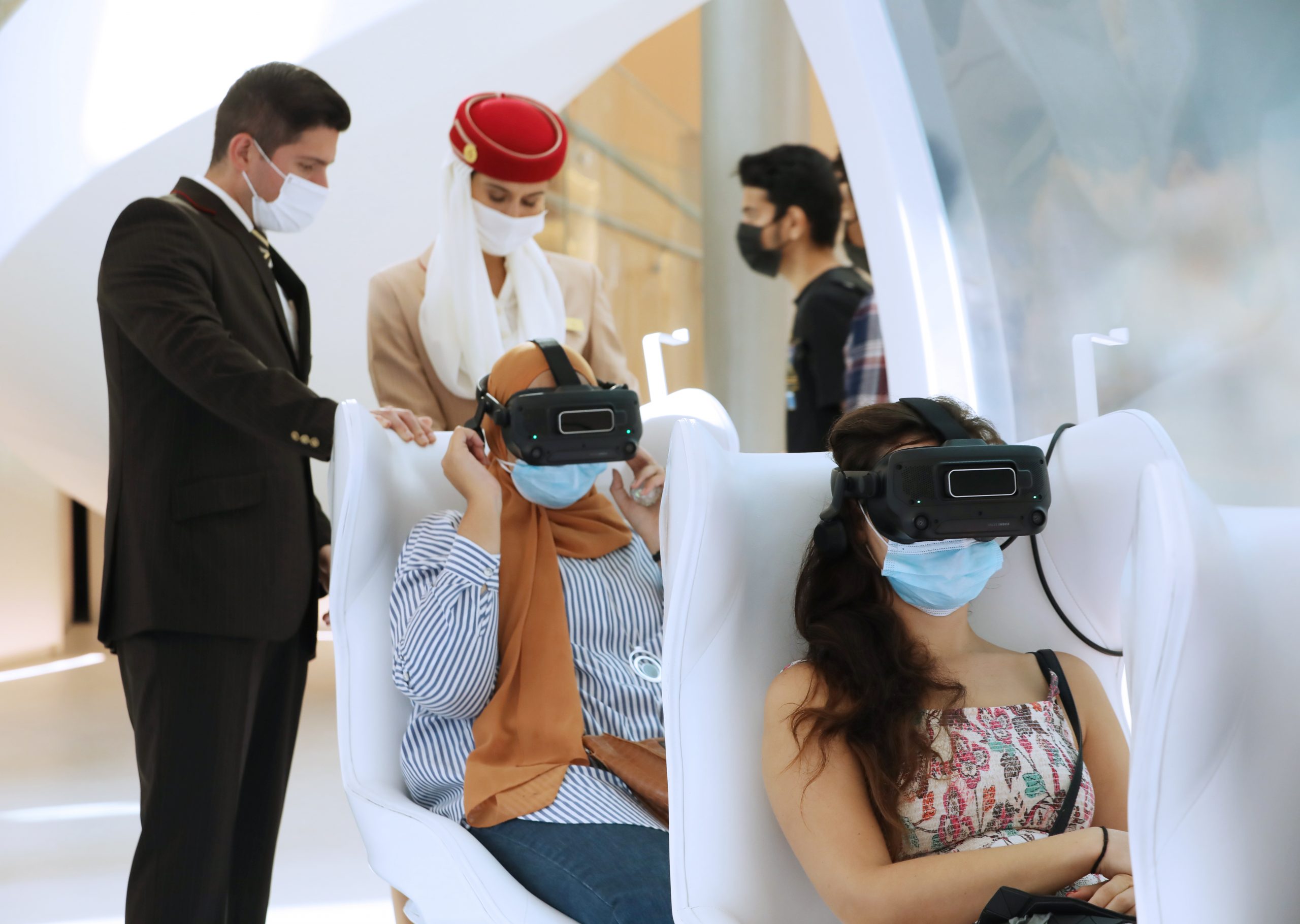 W pawilonie Emirates podczas Expo 2020 najpopularniejszą atrakcją związaną z doświadczeniami „przyszłości lotnictwa komercyjnego” była podróż VR prezentująca wnętrza kabin przyszłych samolotów.