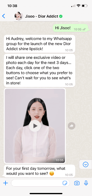 W ramach akcji klienci zostali zaproszeni do udziału w kampanii za pośrednictwem relacji na Instagramie (@diorbeauty), poprzez które Jisoo zaoferowała obserwującym możliwość dołączenia do jej ekskluzywnej grupy na WhatsAppie. Następnie obserwujący zostali przeniesieni na dedykowaną stronę na której, po rejestracji, uzyskali tuż przed premierą nowej szminki Dior Addict shine dostęp do chatbota Jisoo w aplikacji WhatsApp. Osoby, które zaangażowały się w akcję, dostały możliwość wyboru treści, uzyskując dostęp do szerokiej gamy materiałów – od filmów tematycznych po ekskluzywne treści Jisoo.