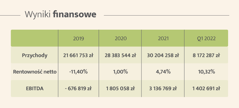 Przychody ze sprzedaży w I kw. 2022 r. wyniosły 8 mln zł, a w całym ubiegłym roku – ponad 30 mln zł1. Spółce udało się m.in. poprawić rentowność i wskaźnik EBIDTA. W tym roku spółka prognozuje przychody na poziomie ponad 37 mln zł, a w kolejnym – 52 mln zł.