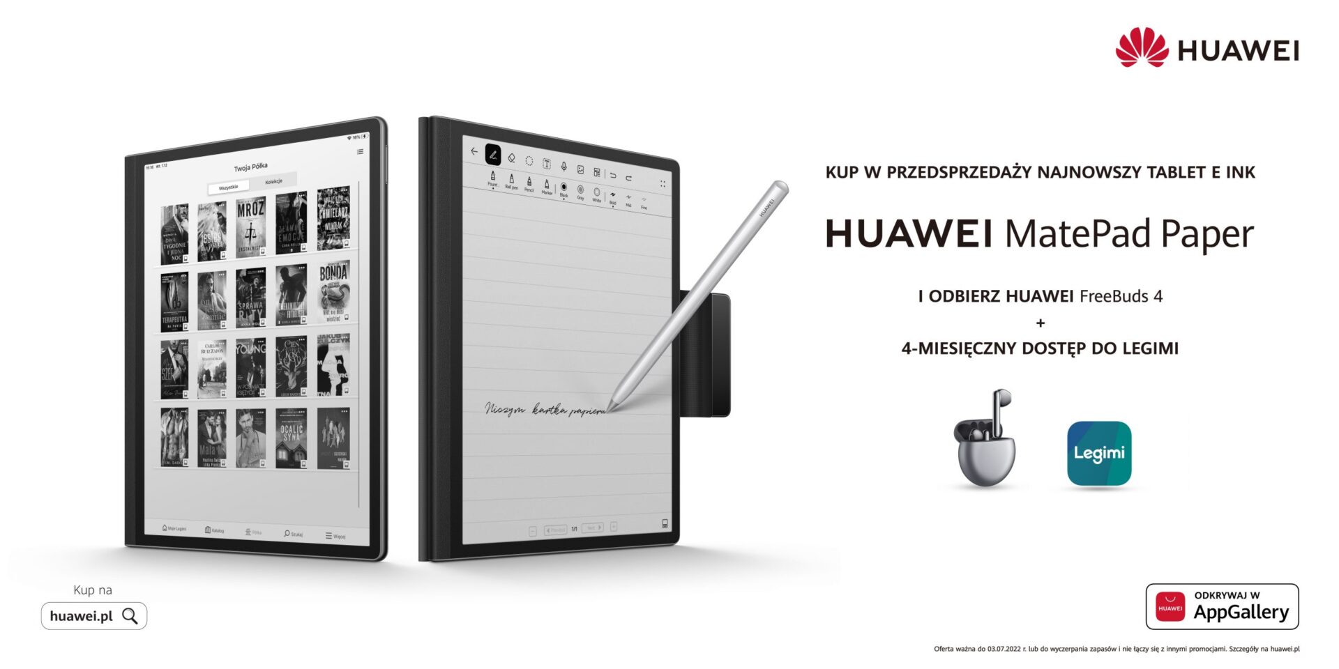 MatePad Paper zadebiutuje w Polsce 4 lipca w cenie 2299 zł, natomiast już od 14 czerwca będzie dostępny w przedsprzedaży, w ramach której pierwsi nabywcy otrzymają w prezencie słuchawki FreeBuds 4 oraz 4-miesięczną subskrypcją Legimi – serwisu zapewniającego nielimitowany dostęp do ponad 140 000 ebooków, audiobooków i synchrobooków® w abonamencie.