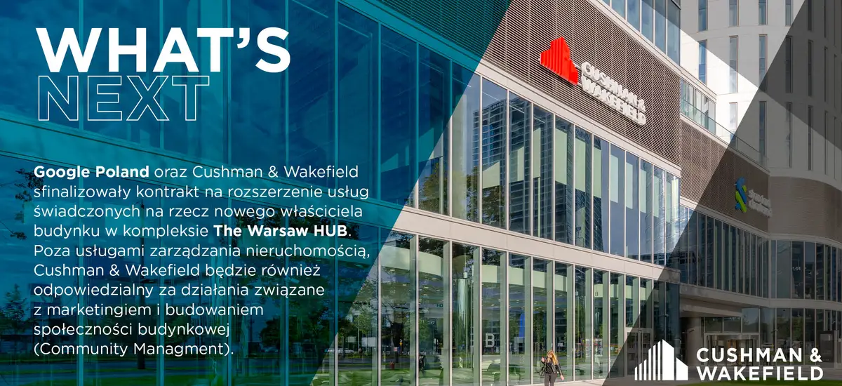 Google Poland oraz międzynarodowa firma doradcza Cushman & Wakefield sfinalizowały kontrakt na rzecz zarządzania kompleksem The Warsaw HUB. Cushman & Wakefield będzie również odpowiedzialny za działania związane z marketingiem i budowaniem społeczności budynkowej (Community Managment). Usługa ta jest realizowana w ramach autorskiego programu „WakeApp Your Office”, wdrożonego w 2021 r. w dziale Asset Services, jako odpowiedź na wyzwania najemców i właścicieli budynków biurowych związane z zachęcaniem pracowników do powrotu do biur po pandemii.