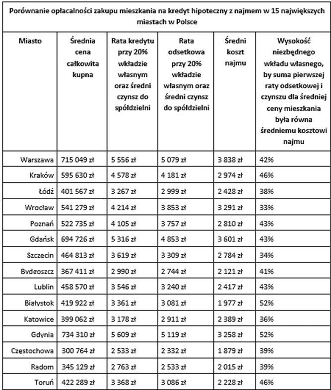 W przypadku zakupu mieszkania na kredyt, oprócz kosztów dodatkowych, pod uwagę należy wziąć także czynsz płacony spółdzielni czy wspólnoty mieszkaniowej. Ciekawym przykładem może być Łódź, w której oferta najmu mieszkań dwupokojowych 50–55 mkw. była najuboższa (65 ogłoszeń), z uwagi na niższe ceny zakupu nieruchomości i dość wysoki koszt średniego czynszu (ponad 480 zł), wkład własny na poziomie 38% zrównuje wysokość raty odsetkowej i kwotę czynszu ze średnim kosztem najmu.