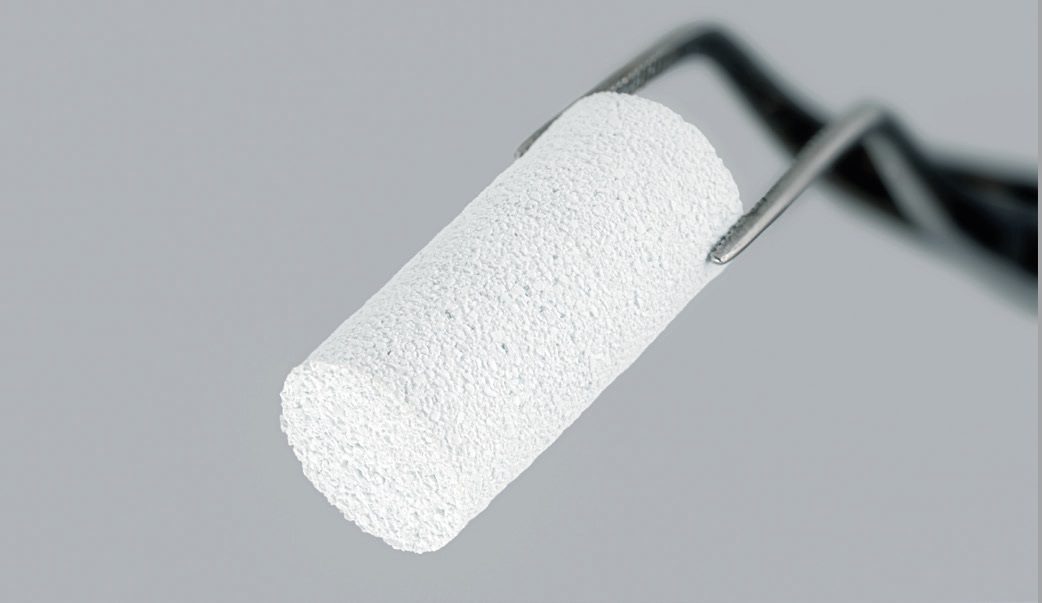 Materiałów kościozastępczych na rynku jest sporo, ale nasz biomateriał FlexiOss® jest unikalny ze względu na skład i właściwości, które posiada. Zwykle materiały – o których mówi się, że są substytutami kostnymi – mają w składzie różne postacie fosforanów wapnia, także syntetyczne polimery chemiczne, bądź jako dodatek naturalne białka, np. kolagen czy żelatynę. Ewentualnie w zabiegach chirurgicznych stosowany jest tzw. łom kostny pochodzący od zmarłych dawców (z banku tkanek). Nasz biomateriał jest pożądany na rynku, bo jest inny. Nie zawiera składników pochodzenia zwierzęcego, w tym białek (kolagenu, żelatyny), dzięki czemu eliminowane jest ryzyko wystąpienia u pacjenta reakcji immunologicznych i alergicznych oraz zainfekowania chorobami odzwierzęcymi. W swoim składzie ma fosforan wapnia, który został wytworzony tak, by miał reaktywność jonową, wpływającą na gospodarkę jonami wapniowymi i fosforanowymi w miejscu wszczepienia. Warto podkreślić, że uzyskana przez nas konformacja kompozytu nie stymuluje procesów prozapalnych w miejscu implantacji. Poza tym FlexiOss® jest nietoksyczny i sprzyja zasiedlaniu komórek kościotwórczych (osteoblastów), jest hemostatyczny, zapobiega więc powstawaniu skrzepów w miejscu implantacji. Dodatkowo można go nasączyć roztworem leków, np. przeciwzapalnych, przeciwbakteryjnych, co ogranicza ryzyko infekcji okołooperacyjnej.