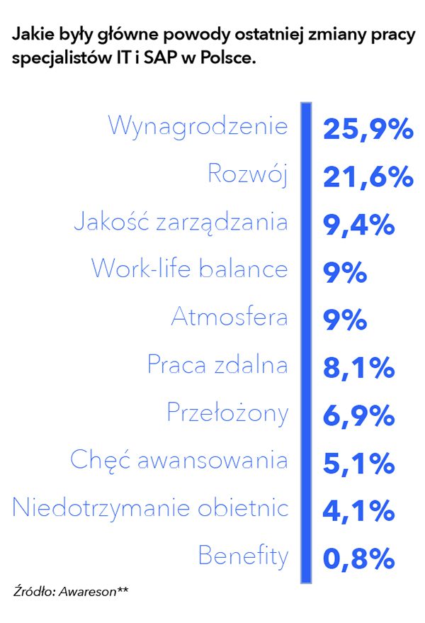 Badanie Awareson pokazuje też, że wynagrodzenie było najczęstszym powodem długotrwałego związania specjalistów IT i SAP z pracodawcą. Jako powód pozostawania