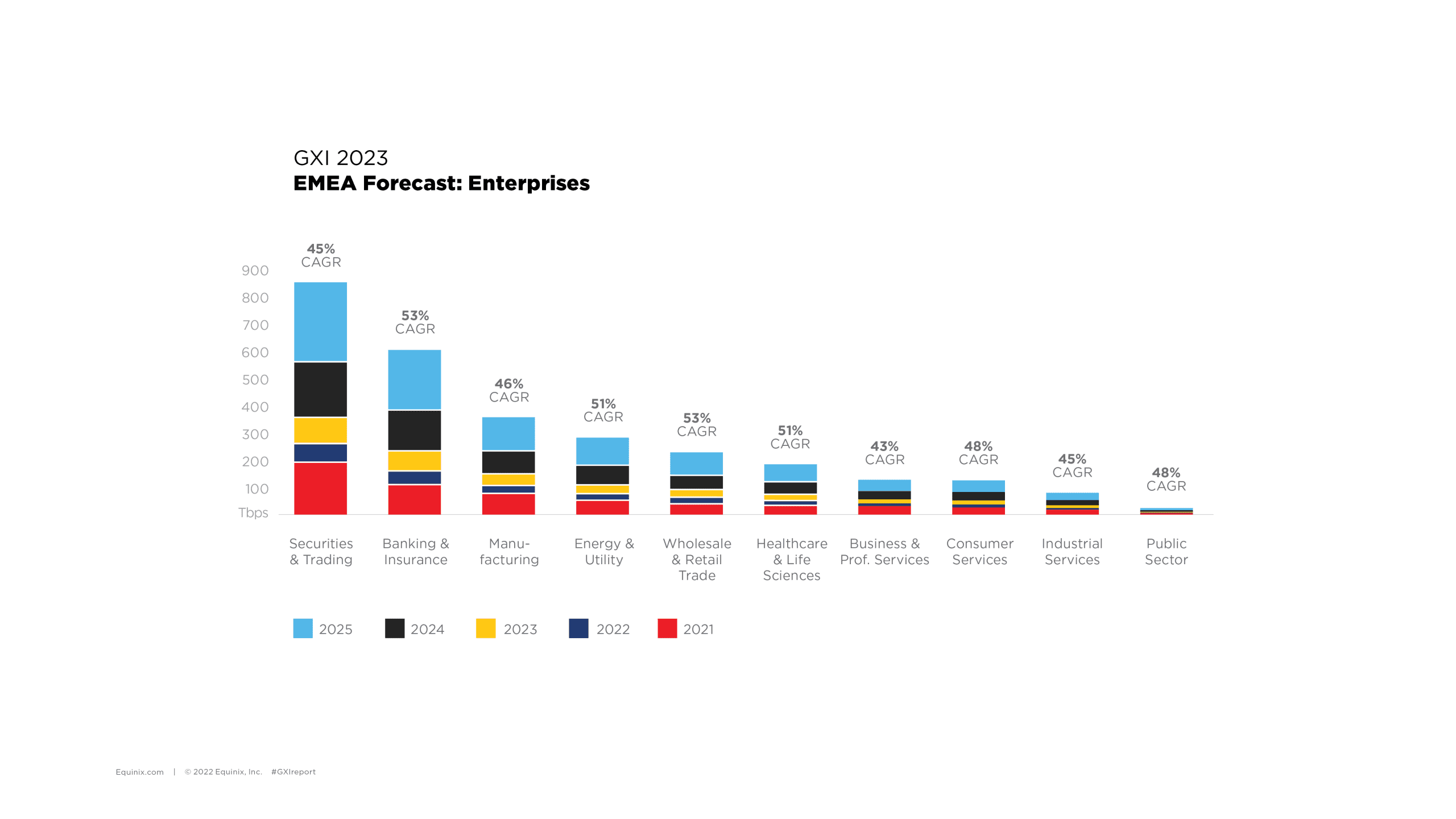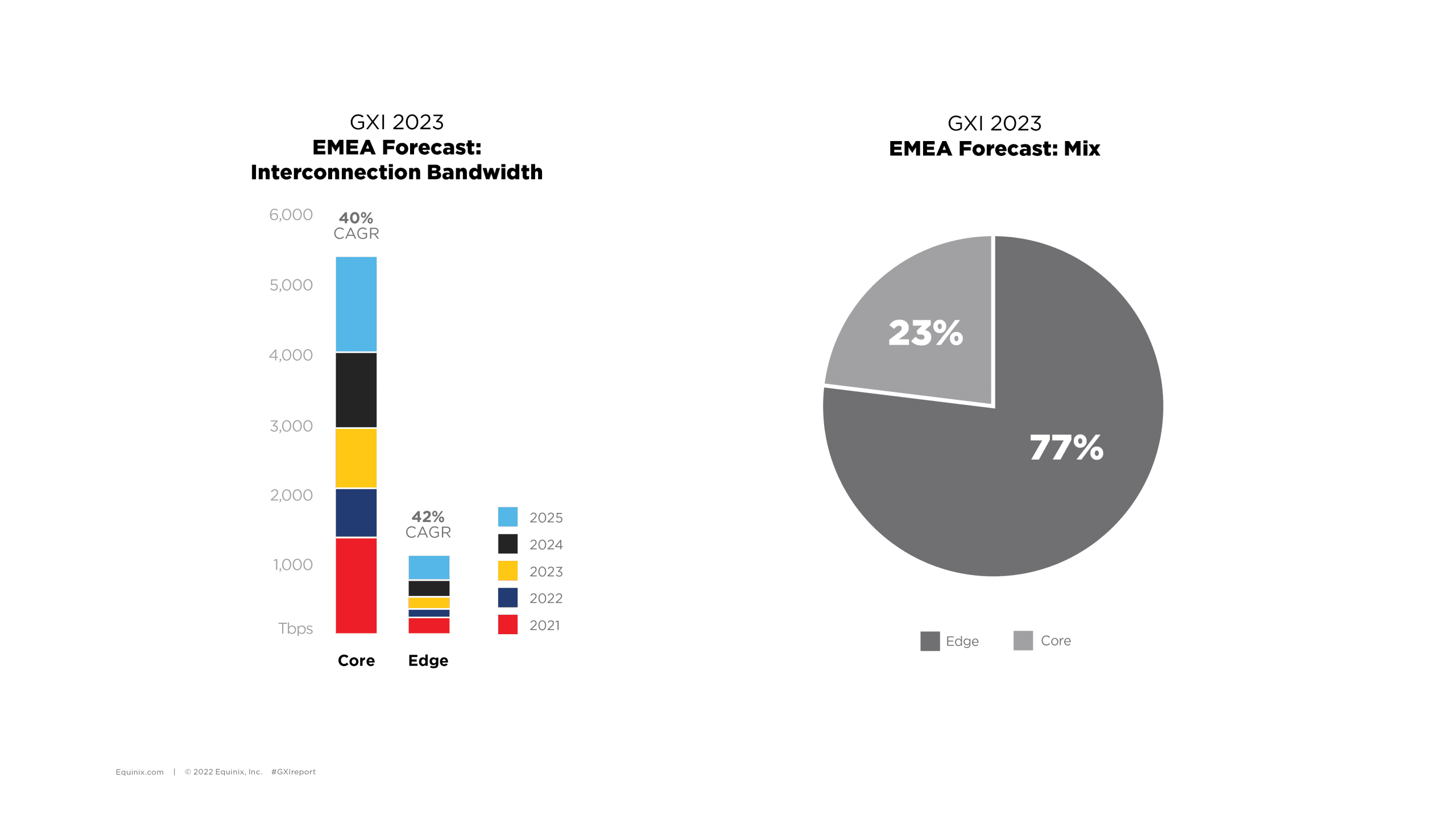 Firmy zmieniają się w następstwie globalnej pandemii, a koncentracja ekosystemów stała się katalizatorem innowacji cyfrowych napędzających wzrost przepustowości połączeń bezpośrednich. Według GXI 2023 prognozuje się, że globalna przepustowość połączeń bezpośrednich osiągnie ponad 27 762 terabitów na sekundę (TBps) do 2025 roku. To oznacza pięcioletnią stopę wzrostu (CAGR) na poziomie 40%. A także równowartość 110 zettabajtów danych wymienianych rocznie lub przepustowości wystarczającej do obsługi ponad 50 milionów autonomicznych samochodów, z których każdy wymienia ponad 2000 terabajtów (TB) danych rocznie. Prognozowany wzrost pokazuje, jak firmy zmieniają swoje podejście do biznesu, aby wdrożyć w przyszłości infrastrukturę na platformach technologicznych.