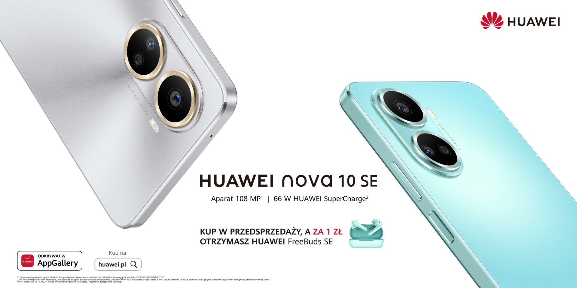 Sugerowana cena detaliczna Huawei nova 10 SE wynosi 1 799 zł. Jego sprzedaż regularna ruszy 31 października, natomiast od 17 do 30 października 2022 r. będzie on dostępny w ofercie specjalnej, w ramach której jego pierwsi nabywcy będą mogli odebrać słuchawki Huawei FreeBuds SE za 1 zł.