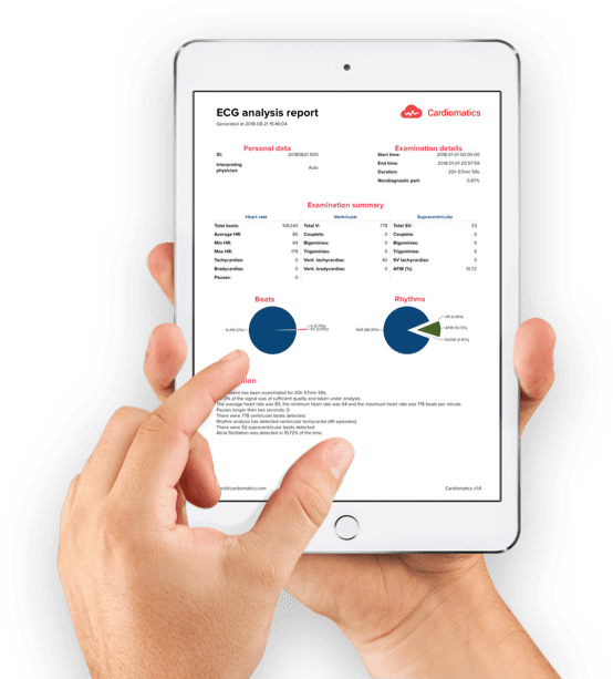 Cardiomatics to certyfikowana platforma internetowa, tworzona przez ekspertów doświadczonych w rozwijaniu sztucznej inteligencji i uczenia maszynowego. Bazując na algorytmach szkolonych w oparciu o miliardy rzeczywistych uderzeń serca pacjentów, łatwe w użyciu oprogramowanie umożliwia dokładne i szybkie wykrywanie i analizę wielu elementów sygnału EKG.