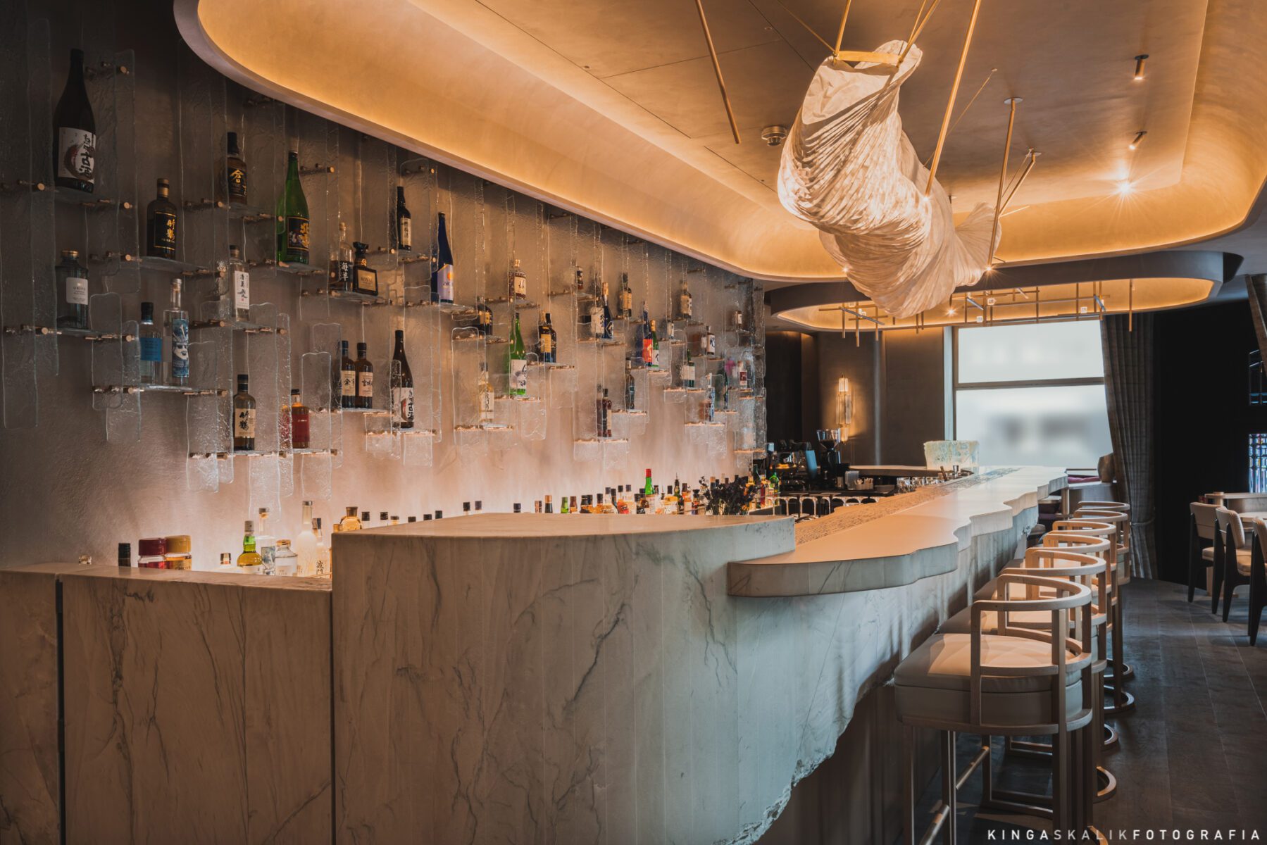 Sakebar by Nobu to powierzchnia około 150 mkw. – z pozoru niewielka, ale wymagająca pod względem jakości wykończenia i niestandardowych rozwiązań czy wręcz kształtów. Mam tu na myśli między innymi skomplikowaną konstrukcję sufitów, które w efekcie sprawiają wrażenie trójwymiarowości czy wykonaną z marmuru majestatyczną ladę barową, która komponuje się z marmurowymi stolikami. Ściany pokryliśmy tynkiem dekoracyjnym o ciepłym odcieniu, a podłoga została wykonana z ciemnego drewna. Ciekawym rozwiązaniem, które wykonaliśmy są wbudowane w ściany cokoły. Za odpowiedni nastrój wnętrza odpowiada m.in. wyselekcjonowane oświetlenie znajdujące się na suficie i na ścianach w postaci kinkietów. – powiedziała Małgorzata Latek, Project Manager, Tétris.