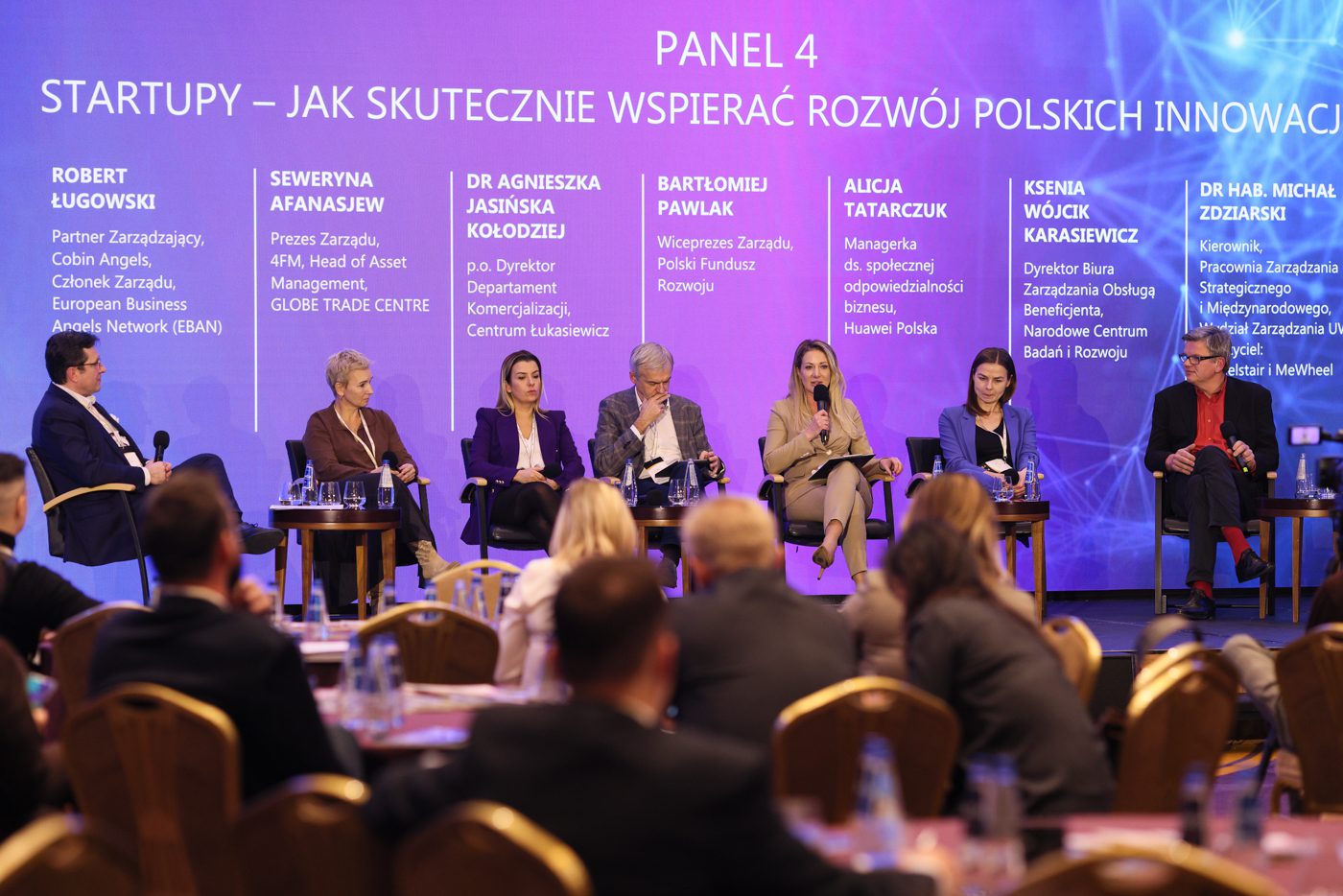 Ostatni panel dyskusyjny pt. “Startupy – jak skutecznie wspierać rozwój polskich innowacji?” poprowadził moderator – Robert Ługowski, Partner Zarządzający, Cobin Angels, Członek Zarządu, European Business Angels Network (EBAN). W dyskusji udział wzięli: Agnieszka Jasińska-Kołodziej, p.o. Dyrektor Departament Komercjalizacji, Centrum Łukasiewicz, Bartłomiej Pawlak, Wiceprezes Zarządu, Polski Fundusz Rozwoju, Seweryna Afanasjew, Prezes Zarządu, 4FM, Head of Asset Management, Globe Trade Centre, Alicja Tatarczuk, Managerka ds. społecznej odpowiedzialności biznesu, Huawei Polska, Ksenia Wójcik-Karasiewicz, Dyrektor Biura Zarządzania Obsługą Beneficjenta, Narodowe Centrum Badań i Rozwoju, Dr hab. Michał Zdziarski, Kierownik, Pracownia Zarządzania Strategicznego i Międzynarodowego, Wydział Zarządzania UW, Założyciel: Wheelstair i MeWheel. Początkowo dyskutanci rozmawiali o tym, czy młode firmy mogą odnieść sukces w startupach, pod skrzydłami wielkich korporacji, korzystając z ich finansowania.