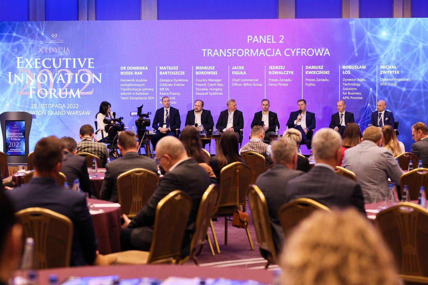 Następnie nadszedł czas na II panel dyskusyjny, moderatorem była Dr Dominika Bosek-Rak, Kierownik studiów podyplomowych Transformacja Cyfrowa, adiunkt w Katedrze Teorii Zarządzania SGH. W gronie panelistów byli: Mateusz Bartoszcze, Zastępca Dyrektora Oddziału Kraków EIB SA, Radca Prawny, Nauczyciel Akademicki, Ireneusz Borowski, Country Manager, Dassault Systèmes, Jacek Figuła, Chief Commercial Officer, Billon Group, Jędrzej Kowalczyk, Prezes Zarządu, FANUC Polska, Dariusz Kwieciński, Prezes Zarządu, Fujitsu, Bogusław Łoś, Dyrektor działu Technology Solutions for Business, APN Promise, Michał Zwyrtek, Dyrektor Finansowy, APA Group. Paneliści dyskutowali m.in. o działaniach, które organizacja musi podjąć, aby zoptymalizować operacje i zwiększyć produktywność, a także o roli cyfryzacji w skalowalności biznesu. Ponadto wspomniano o największych wyzwaniach w procesie transformacji cyfrowej oraz wpływie obecnej sytuacji ekonomicznej, geopolitycznej, środowiskowej i społecznej na trendy w transformacji cyfrowej. Sporo czasu paneliści poświęcili technologii blockchain i jej zastosowaniu w korporacjach.