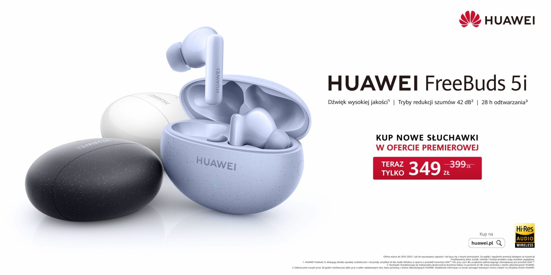 W ramach oferty premierowej klienci sklepu Huawei.pl w zestawie ze słuchawkami HUAWEI FreeBuds 5i otrzymają w prezencie dodatkowe etui zabezpieczające oraz usługę uprawniającą do zniżki ‑50% przy zakupie nowej słuchawki w miejsce zagubionej lub zniszczonej. Na kupujących czekają dodatkowe korzyści w postaci szybkiej dostawy, dodatkowej obniżki o wartości 50 zł za zapisanie się na newsletter, możliwość zakupu przedłużonej gwarancji na preferencyjnych warunkach oraz zdobycia podwojonych punktów w programie lojalnościowym, które można wymienić na zniżki.