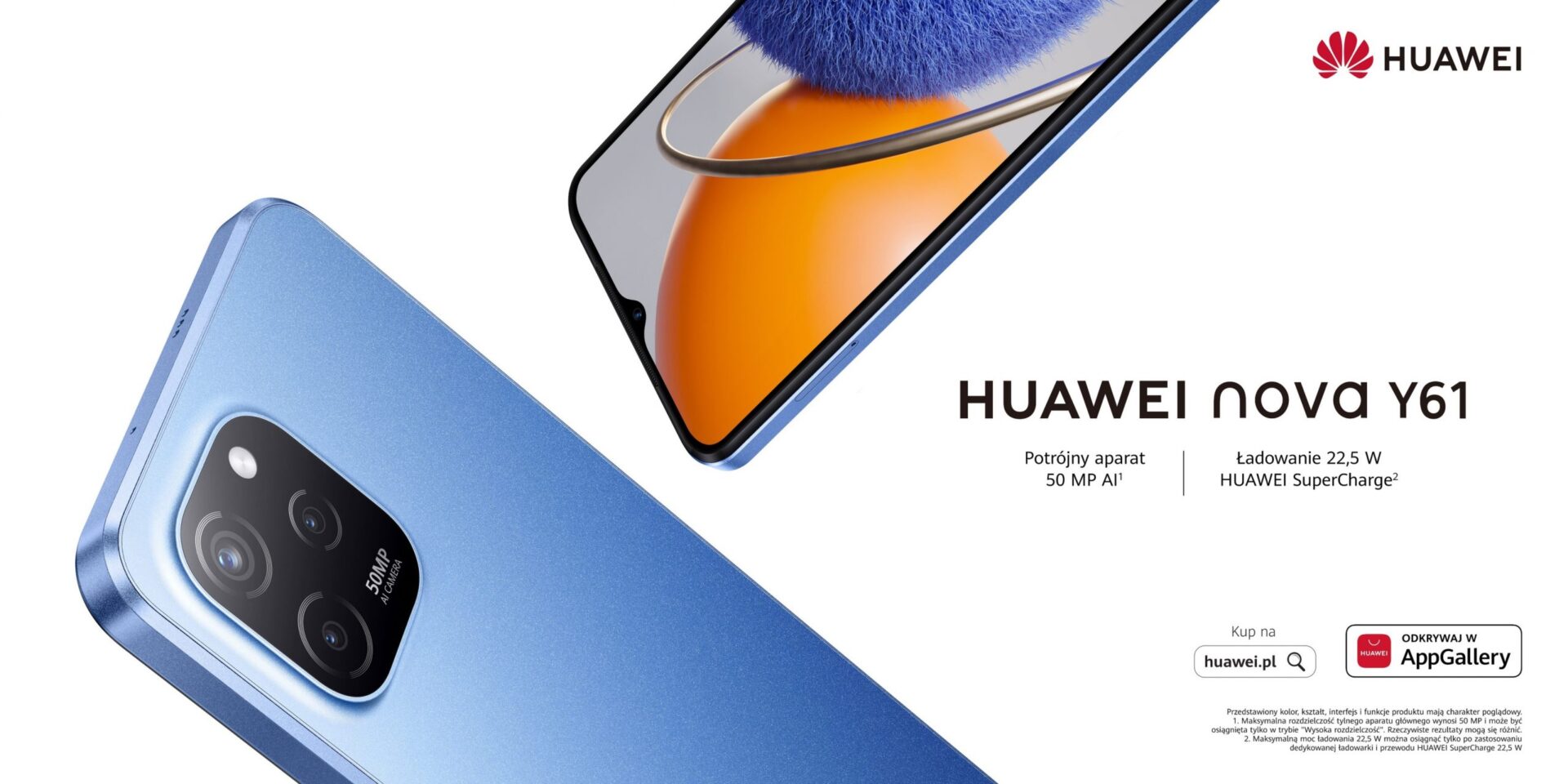 Huawei CBG Polska wprowadza do sprzedaży HUAWEI nova Y61. Smartfon wyposażony został w pojemną baterię 5000 mAh wspierającą szybkie ładowanie 22,5 W HUAWEI SuperCharge. Za dobrej jakości zdjęcia odpowiada w nim 50‑megapikselowy aparat główny z jasnym obiektywem f/1.8, wspomagany obiektywami makro i do pomiaru głębi ostrości. Duży ekran o przekątnej 6,52” cechuje zaawansowana ochrona wzroku zwiększająca komfort użytkowania, a za płynność obsługi odpowiada EMUI 12. HUAWEI nova Y61 dostępny jest w trzech wersjach kolorystycznych z efektem gwiezdnego połysku: niebieskiej, zielonej i klasycznej – czarnej.