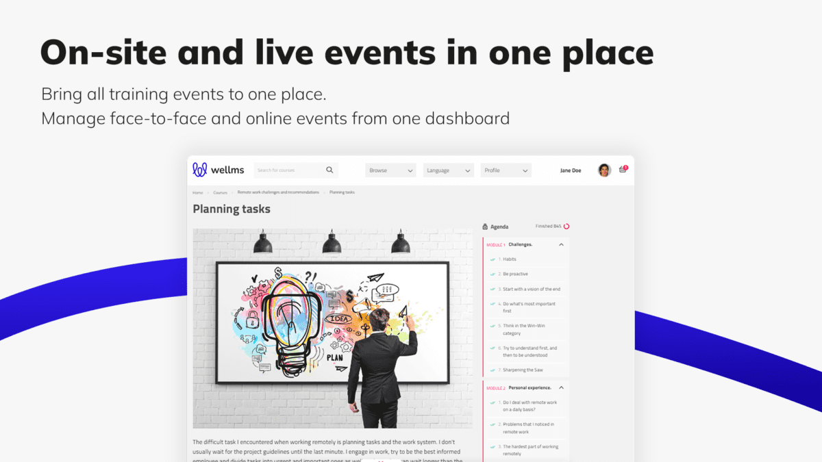 Wellms pozwala wdrożyć multimedialną platformę e-learningową 5 razy szybciej, niż obecni na rynku konkurenci. W planach rozwoju jest rozbudowa oferty o opcję wyświetlania treści szkoleniowych na nieoczywistych, innych niż powszechnie wykorzystywanych w e-learningu, urządzeniach, takich jak: gogle VR / AR, smart TV czy HHT (handheld terminals). Dzięki Wellms, firmy, organizacje i uczelnie mogą sprawnie uruchomić własne środowisko szkoleniowe, również w organizacji rozproszonej, z uwzględnieniem materiałów wideo, dźwiękowych i animacyjnych.