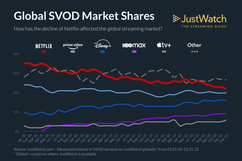 Streaming: Od 2020 roku globalny gigant Netflix stracił 13% udziałów w rynku streamingu. Pomimo posiadania silnych programów (jak „Wednesday”, „Squid Games”, „Stranger Things”) nadal spada udział w rynku platformy. Disney w tym samym czasie systematycznie wzrastał – jednak wydaje się, że osiągnął równowagę, co może być czynnikiem przyczyniającym się do ostatnich wiadomości o wyzwaniach koncernu, ocenia firma monitorująca rynek SVOD JustWatch.