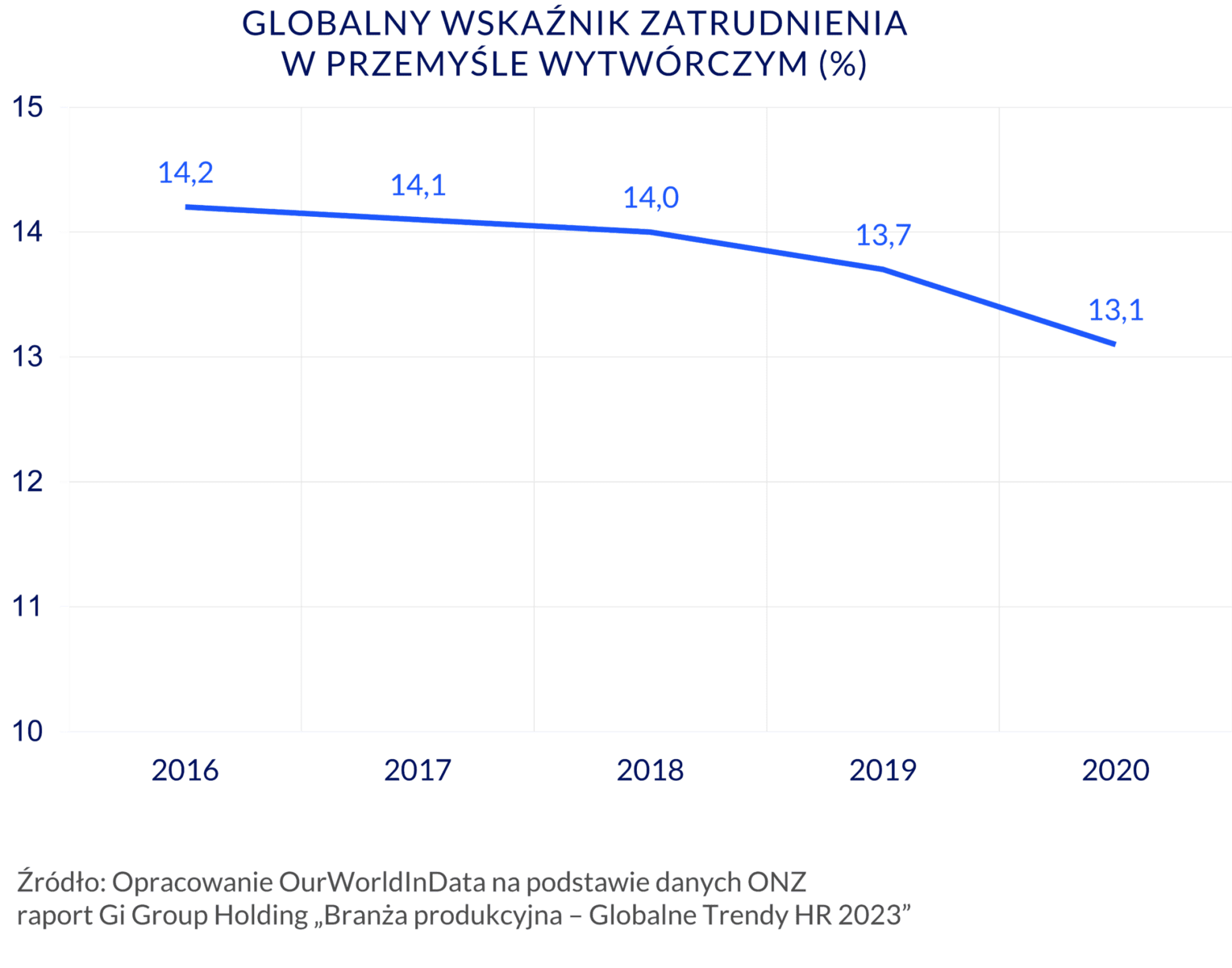 Niedobór pracowników to zdecydowanie największy problem, z jakim boryka się przemysł. Dane Gi Group Holding wskazują na stały spadek globalnego wskaźnika zatrudnienia w branży produkcyjnej. W Polsce aż 78% firm zgłosiło trudności w znalezieniu zarówno pracowników fizycznych, jak i w rekrutacji bardziej wykwalifikowanej kadry.
