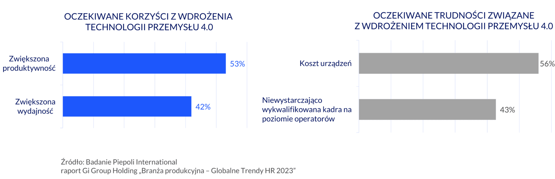 Przedsiębiorstwa inwestują w specjalistyczne oprogramowanie lub narzędzia robotyczne w celu usprawnienia procesów i optymalizacji produkcji. W badaniu Gi Group Holding aż 90% firm w Polsce (podobny odsetek odnotowano w Wielkiej Brytanii) zadeklarowało, że wprowadziło już niektóre technologie wspomagające transformację cyfrową, np. przetwarzanie w chmurze czy integrację cyfrową. Polskie firmy wykazują też wysoką skłonność do wdrażania nowych technologii – 32% rodzimych przedsiębiorstw ma zamiar zainwestować w takie rozwiązania w ciągu najbliższych pięciu lat (średnia dla wszystkich badanych krajów – 26%).