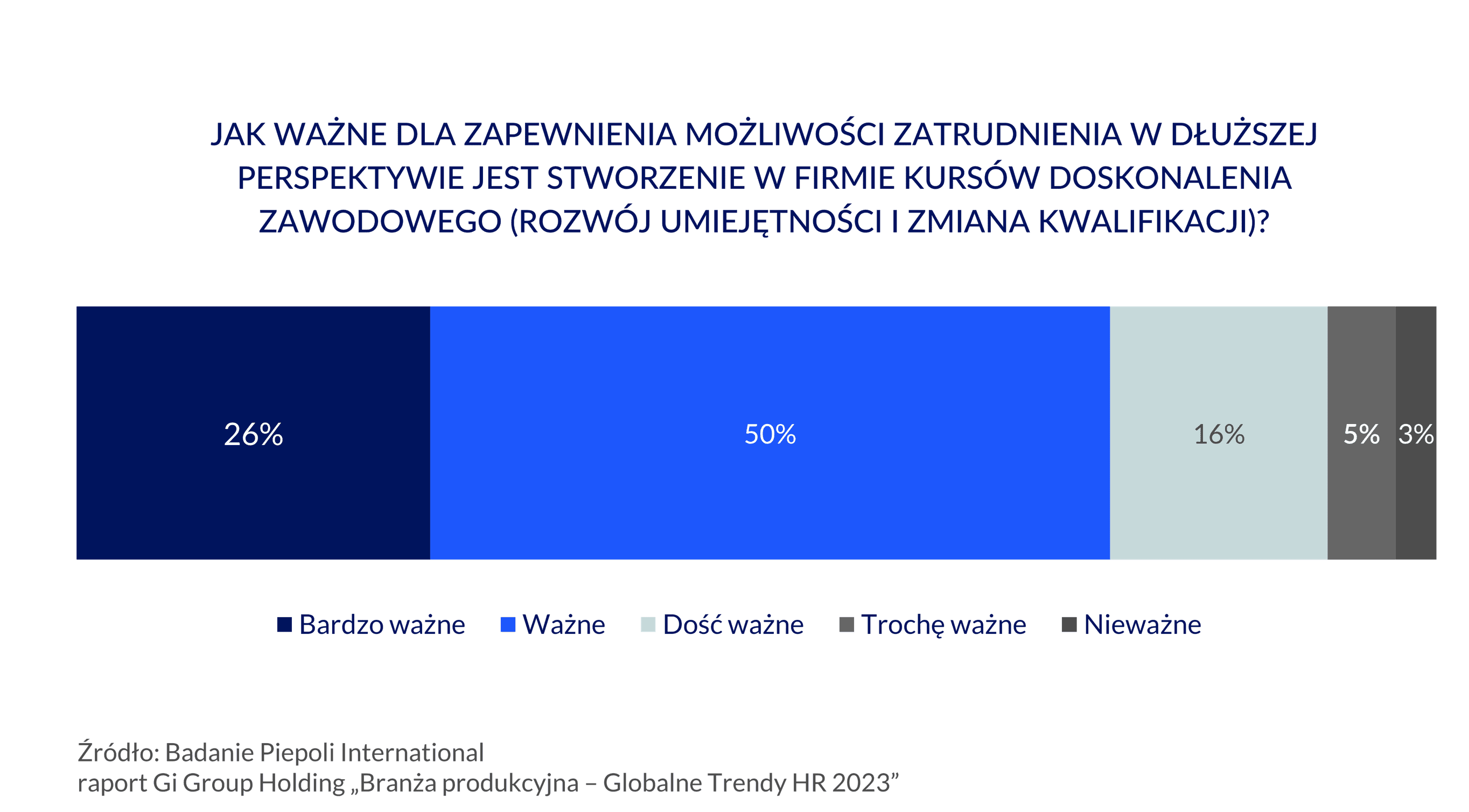 Ciągłe podnoszenie kwalifikacji jest uważane za kluczowy czynnik gwarantujący utrzymanie zatrudnienia przez cały okres życia zawodowego przez 83% uczestników badania. Szkolenia wewnętrzne umożliwiają połączenie posiadanego doświadczenia z nowymi umiejętnościami i dają możliwość rozwoju kompetencji pracowników lub ich przekwalifikowania zgodnie z rzeczywistymi potrzebami firmy. Przemysł wytwórczy zwraca szczególną uwagę na szkolenia w zakresie użytkowania i zarządzania narzędziami cyfrowymi. Jak wynika z raportu, aż 97% polskich firm już zaplanowało wewnętrzne lub zewnętrzne szkolenia dotyczące wykorzystania narzędzi cyfrowych i zarządzania nimi.
