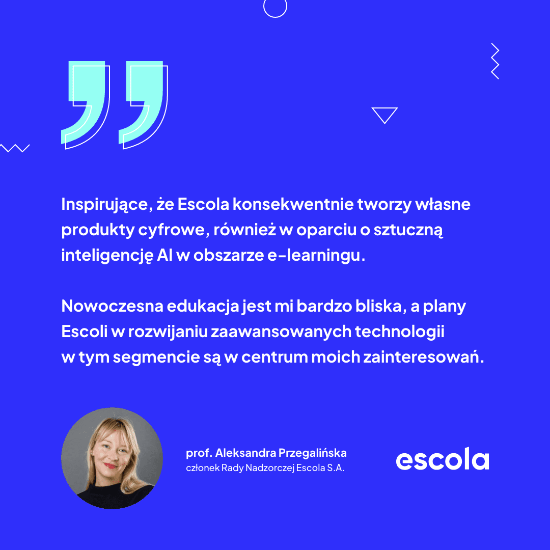 Obserwuję Escola od dawna, znam ludzi, którzy ją tworzą i bardzo cenię ich dotychczasowe sukcesy. Cieszę się z propozycji dołączenia do Rady Nadzorczej, dzięki czemu będę teraz mogła być blisko jej rozwoju. Inspirujące, że firma konsekwentnie tworzy własne produkty cyfrowe, również w oparciu o sztuczną inteligencję AI w obszarze e-learningu. Nowoczesna edukacja jest mi bardzo bliska, a plany Escoli w rozwijaniu zaawansowanych technologii w tym segmencie są w centrum moich zainteresowań. – mówi prof. Aleksandra Przegalińska, członek Rady Nadzorczej Escola S.A.