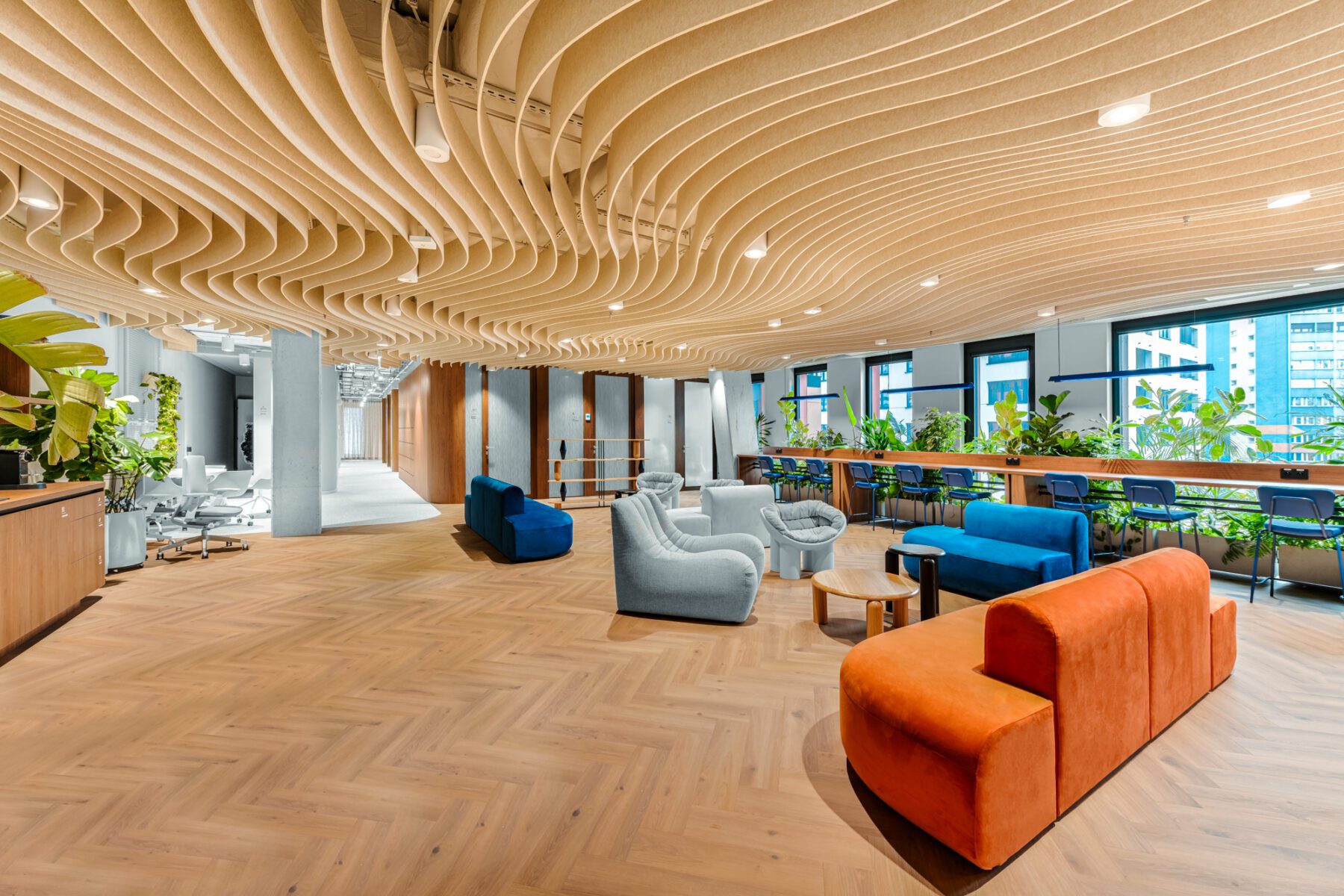 W nowej lokalizacji nie znajdziemy standardowych sal konferencyjnych, czy monotonnego wyposażenia charakterystycznego dla znanych nam open space’ów. W dobie powszechnej pracy zdalnej wyzwaniem jest zaprojektowanie przestrzeni zachęcającej współpracowników do pracy z siedziby firmy. Priorytetem było więc stworzenie miejsca kojarzącego się z domem, ale posiadającego funkcję biura, które będzie sprzyjać integracji i zlikwiduje wszelkie bariery komunikacyjne.