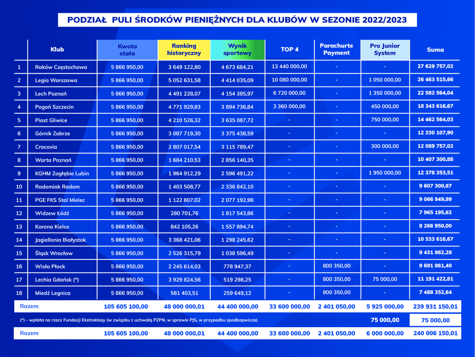 Łączne wypłaty z Ekstraklasy dla 18 klubów uczestniczących w rozrywkach ligowych wyniosły ponad 240 mln zł w sezonie 2022/2023, czyli o 10 mln zł więcej niż zakładał początkowy budżet. Kluby otrzymały też z ligi ponad 2,5 mln zł w formie barterów.