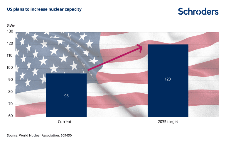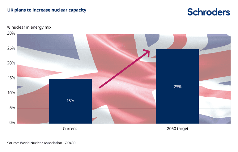 Jak wskazuje Samuel Thomas, Sustainable Investment Analyst w Schroders, obecnie obserwujemy rosnące poparcie dla energii jądrowej. Jeśli obecne zobowiązania polityczne zostaną zrealizowane, to w najbliżej dekadzie na całym świecie powstaną setki nowych reaktorów wytwarzających energię.