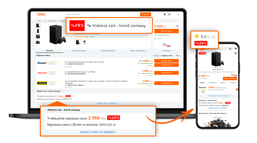 A najlepiej zrobić to na Ceneo.pl. Narzędzie „Historia cen – trend cenowy” pozwala nam sprawdzić, jak zmieniały się ceny pożądanego przez nas produktu w ciągu ostatniego pół roku. I nie dotyczy to jednego sklepu, a wszystkich ofert, które trafiły do Ceneo.pl.