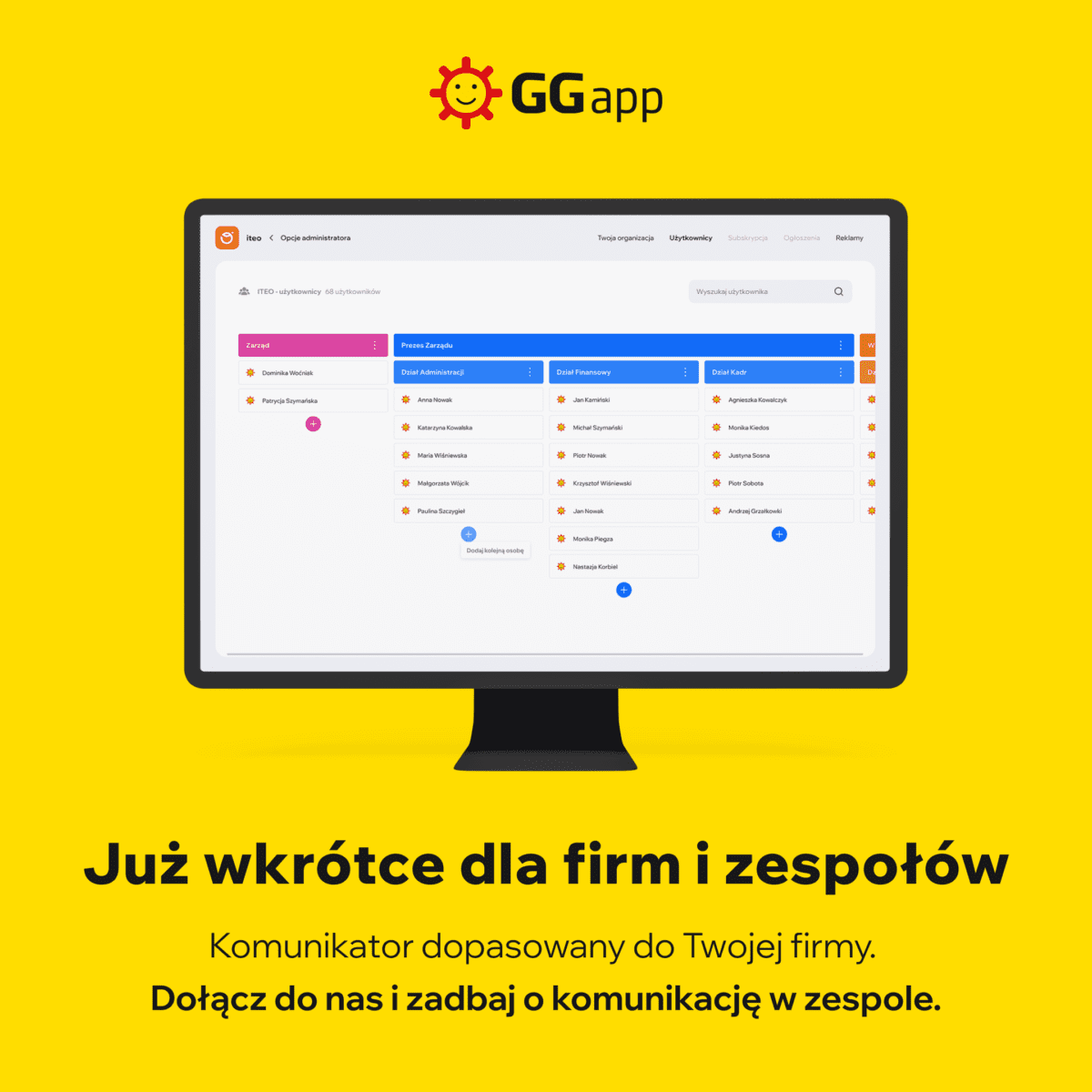 Lista kontaktów oparta na schemacie organizacyjnym firmy, możliwość zarządzania numerami nowych i odchodzących pracowników, pula numerów w ramach organizacji, rozmowy audio-wideo – to tylko niektóre zalety powstającej specjalnej wersji komunikatora GG dla firm i instytucji. Właściciel komunikatora wkrótce rozpocznie testy aplikacji GGapp do komunikacji wewnętrznej w firmach. Już dzisiaj ruszają zapisy do testów.