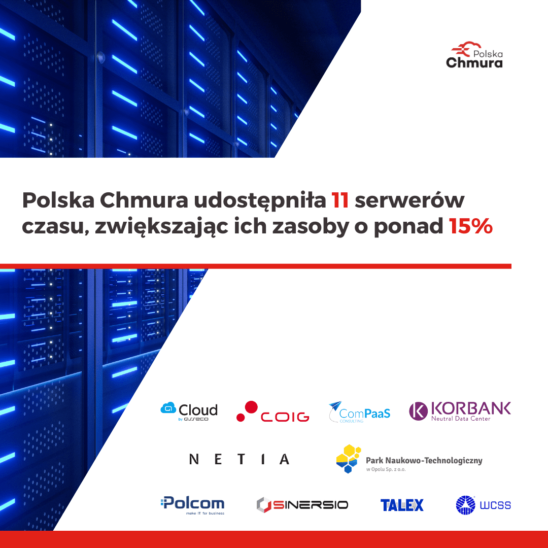 Polska Chmura — związek polskich centrów danych — udostępniła 11 serwerów czasu, zwiększając ich krajowe zasoby o ponad 15 procent. Firmy należące do związku zobowiązały się do nieodpłatnego udostępniania swoich zasobów serwerowych,by udzielić wsparcia firmom i organizacjom w zakresie synchronizacji czasu, co może mieć wpływ na cyberbezpieczeństwo.