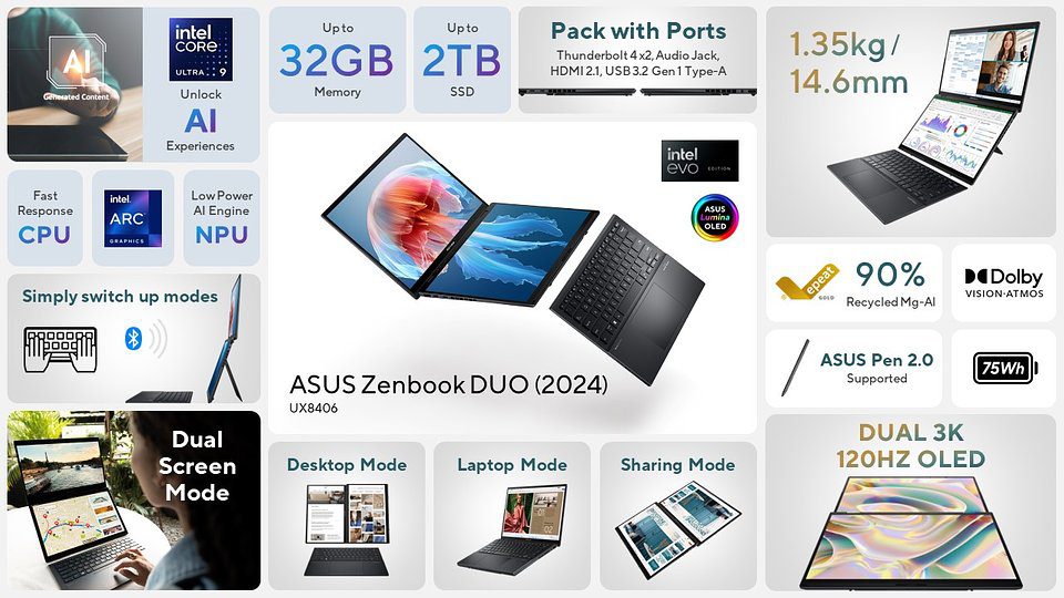 ASUS wprowadza na polski rynek nowy, rewolucyjny Zenbook DUO (2024) UX8406 – pierwszy na świecie ultramobilny laptop z dwoma 14-calowymi ekranami dotykowymi OLED o rozdzielczości 3K i częstotliwości odświeżania 120 Hz1. To niesamowite urządzenie wyposażone w odłączaną, pełnowymiarową klawiaturę Bluetooth® i touchpad ASUS ErgoSense, zmienia pojęcie uniwersalności urządzeń mobilnych.