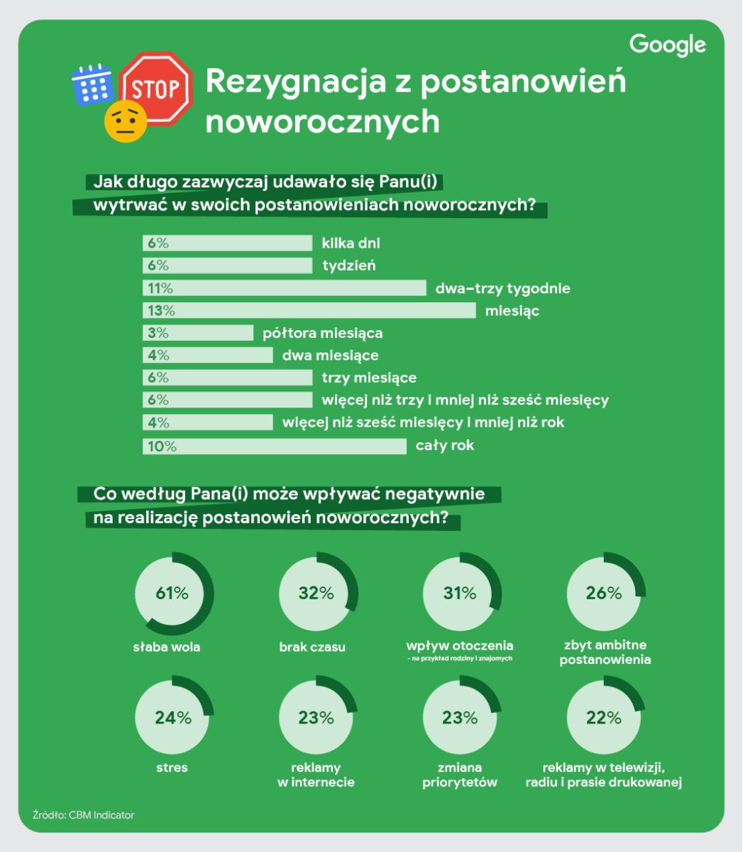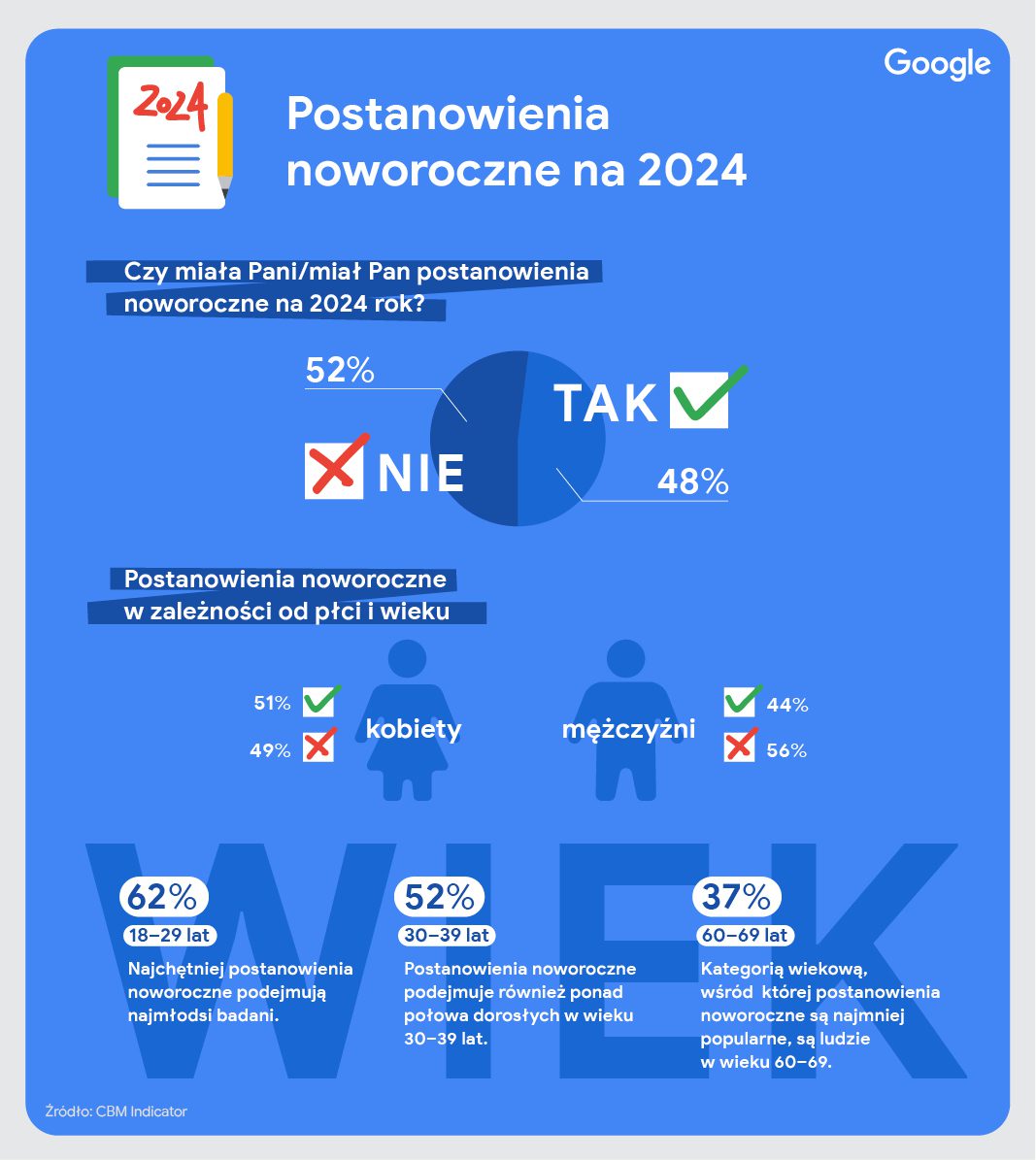 Według badania „Wpływ reklam na postanowienia noworoczne w opinii Polaków” przeprowadzonego przez CBM Indicator na zlecenie Google w styczniu 2024 roku1, postanowienia noworoczne na ten rok podjęła około połowa Polek i Polaków (48%). Dotyczą one najczęściej dbania o zdrowie (44%), aktywności fizycznej (44%), rozwoju osobistego i hobby (21%). 20% badanych wskazało przejście na dietę jako swój główny cel.