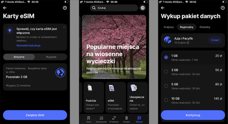 Dzięki instalacji cyfrowej karty eSIM w aplikacji Revolut, klienci planu Ultra otrzymają dostęp do kolejnego benefitu (bez opłat, w ramach posiadanego planu): pakietu 3 GB mobilnego przesyłu danych miesięcznie do wykorzystania na całym świecie (niezależnie od kraju). Pozostali klienci w Polsce, którzy zainstalują eSIM przed 1 maja 2024 r., będą mogli skorzystać z powitalnych 100 MB przesyłu danych za darmo (obowiązuje regulamin).