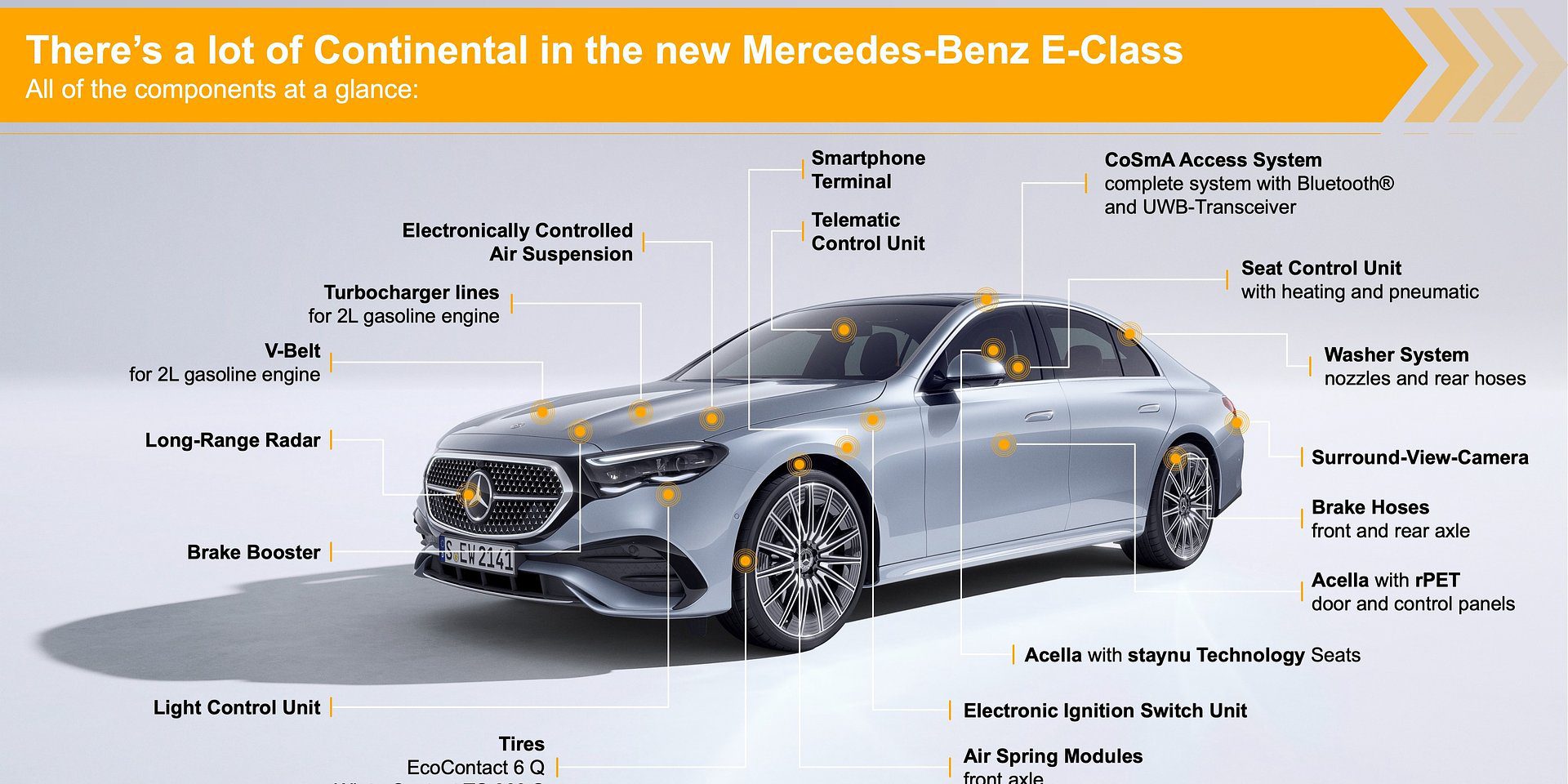 Continental dostarcza ważne komponenty i produkty do nowego Mercedesa Klasy E. Dzięki rozwiązaniu dostępu opartemu na inteligentnych urządzeniach (Continental’s smart device-based access; CoSmA) firma technologiczna Continental oferuje system dostępu, który zamienia urządzenia mobilne, takie jak smartfony lub smartwatche, w kluczyki do samochodu.