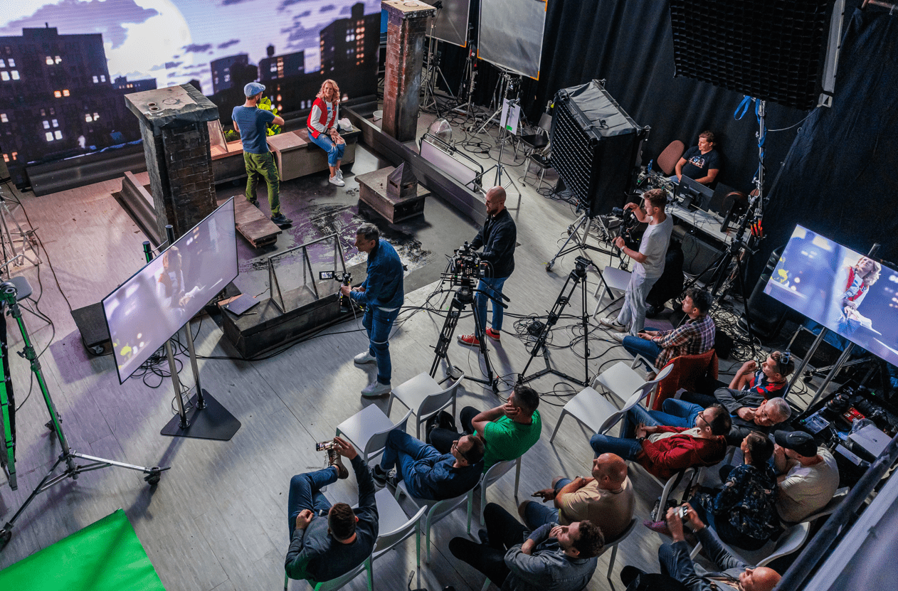 Profesjonalne studio telewizyjne wyposażone w najnowocześniejsze kamery i zaawansowane systemy oświetleniowe. Wsparcie przez doświadczoną ekipę filmową i autentyczną scenografię, idealne warunki do produkcji telewizyjnych na najwyższym poziomie oraz innowacyjny system do wirtualnej produkcji filmowej i zdjęciowej HTC VIVE MARS Camtrack w akcji.