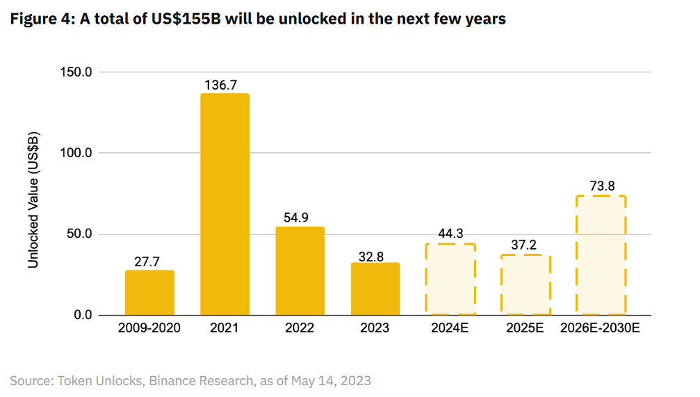 W latach 2024-2030 zostaną odblokowane tokeny firm działających na rynku Web3 i blockchain o wartości około 155 miliardów dolarów. Bez zwiększonego popytu po stronie kupujących, te odblokowania mogą wywrzeć znaczną presję spadkową na ceny tokenów, co w konsekwencji może doprowadzi do spadku wartości wielu firm. W szczególności dot. to nowych projektów, które zadebiutowały na rynku w ostatnim czasie – wynika z najnowszego raportu autorstwa Binance Research.