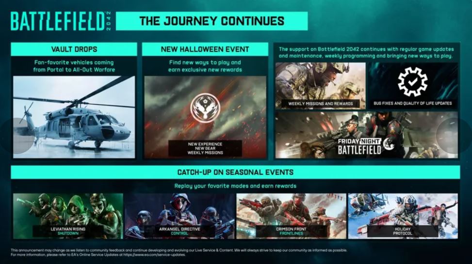 Electronic Arts, DICE: Zespół odpowiedzialny za „Battlefield 2042” nieustannie aktualizuje zawartość i udoskonala jakość rozgrywki, a także nie zapomniano o atrakcjach związanych z Battlefield Portal i #FridayNightBattlefield, podały firmy. Do Battlefield 2042 powrócą znane graczom wydarzenia, a wraz z nimi nagrody. Pierwszym z nich będzie „Przebudzenia Lewiatana”, które powróci już w lipcu. Do Battlefield 2042 trafią również wydarzenia, które przez ponad cztery tygodnie pozwolą graczom poznać nowe tryby rozgrywki, zdobywać postępy dzięki przepustce wydarzeń, a także uzyskać dostęp do nowych do nowych przedmiotów kosmetycznych. Pierwsze z tych wydarzeń zostanie wprowadzone podczas nadchodzącego Halloween. W czasie trwających kilka tygodni wydarzeń gracze będą mogli wypróbować i odblokować zawartość dostępną w Battlefield Portal w trybie wojny totalnej. Zrzuty skarbca rozpoczną się w dalszej części roku od pojazdu z Battlefield Portal.