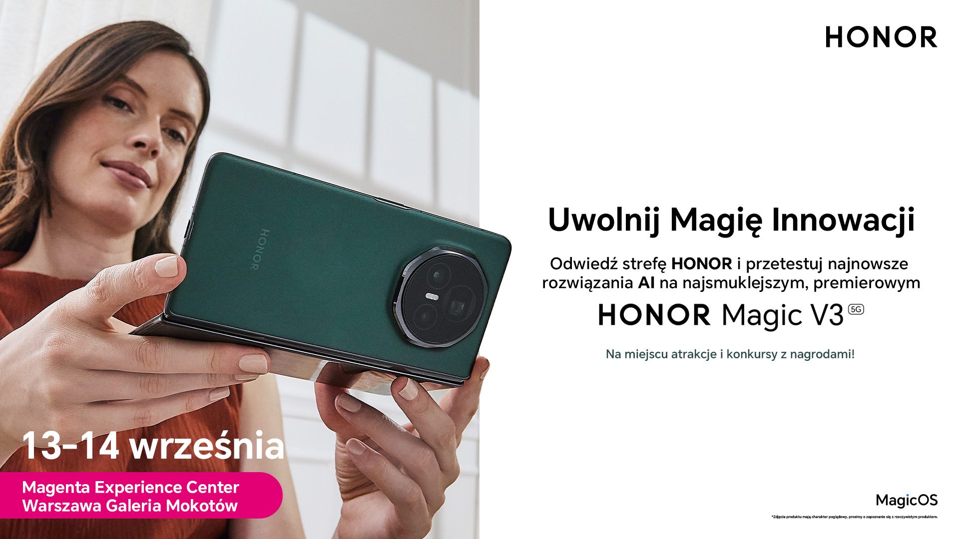 Z okazji nawiązania współpracy oraz premiery HONOR Magic V3 w Polsce obie marki organizują w dniach 13 i 14 września wydarzenie dla konsumentów, w ramach którego każdy uczestnik będzie mógł przetestować smartfon HONOR Magic V3. Spotkanie odbędzie się w Magenta Experience Center, mieszczącym się w centrum handlowym Westfield Mokotów, przy ulicy Wołoskiej 12 w Warszawie. Na odwiedzających salon T-Mobile czekają też inne atrakcje, szczegóły zostaną zaprezentowane na miejscu.