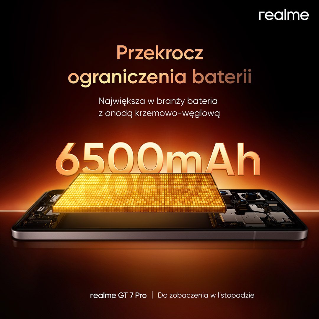 realme: Marka zaprezentuje w Polsce w listopadzie swój flagowy smartfon – realme GT 7 Pro. Urządzenie wyposażono w procesor Snapdragon 8 Elite. Dodatkowo, smartfon posiada baterię o pojemności 6500 mAh oraz szybkie ładowanie 120 W, dzięki czemu naładowanie do 50% zajmuje 13 minut, a pełne naładowanie – 37 minut.