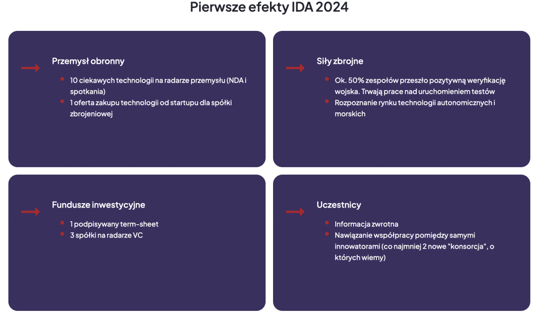 W tegorocznej edycji programu IDA odbyły się dwa intensywne bootcampy, w których wzięły udział 34 zespoły. Łącznie ponad 100 uczestników wzięło udział w ponad 500 indywidualnych spotkaniach z ekspertami oraz skorzystali z 200 godzin mentoringu. Efektem były pozytywne weryfikacje wojskowe dla blisko połowy zespołów, które zyskały możliwość testowania swoich technologii we współpracy z wojskiem. 10 rozwiązań znalazło się w kręgu zainteresowania przemysłu obronnego, a jedno już otrzymało ofertę zakupu. Program zyskał wysokie oceny – średnia ocena to 4,3/5, a wskaźnik NPS (ang. Net Promoter Score) wyniósł 84%.