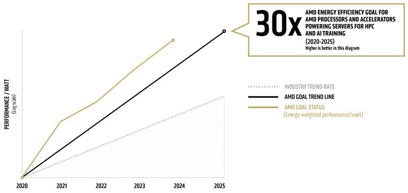 Na blogu firmy AMD opublikowano informacje na temat postępów w realizacji celu „30×25”, czyli wysiłków, aby do 2025 roku 30-krotnie zwiększyć efektywność energetyczną sprzętu AMD napędzającego superkomputery i sztuczną inteligencję. Firma potwierdziła, że jest obecnie na poziomie 28,3-krotnej poprawy w tej dziedzinie w porównaniu do stanu na 2020 rok.