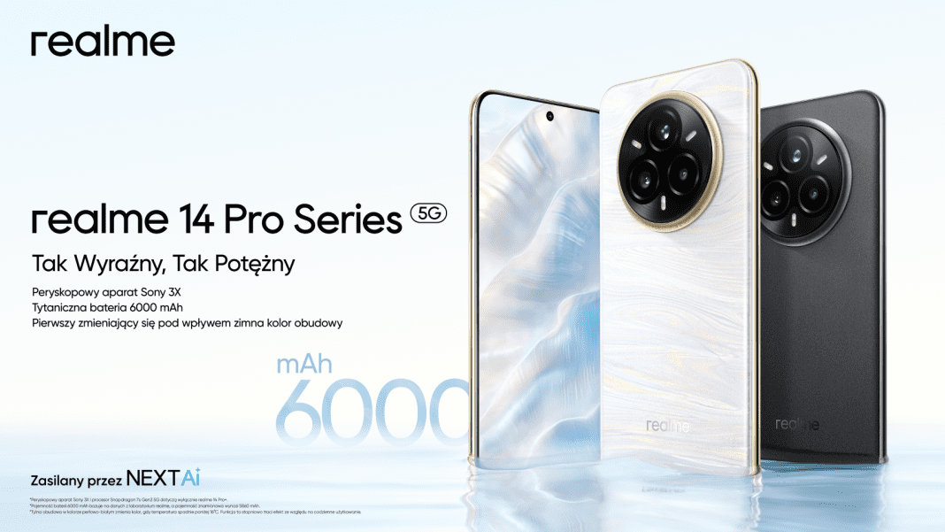 Model realme 14 Pro+, pozycjonowany jako flagowy aparat średniej klasy, na nowo definiuje obrazowanie średniej klasy z flagowymi specyfikacjami. Wyposażony jest w- aparat główny Sony IMX896 OIS o rozdzielczości 50 MP w połączeniu z ekskluzywnym w tym segmencie teleobiektywem peryskopowym (1/2-calowy czujnik Sony IMX882), umożliwiającym 120-krotny SuperZoom do rejestrowania odległych szczegółów z wyrazistością podobną do lustrzanki cyfrowej. Zasilany przez procesor Qualcomm Snapdragon® 7s Gen 3 5G i NEXT AI, wprowadza potrójną lampę błyskową MagicGlow do portretów nocnych, a także Ultrawyrazistość AI 2.0 do wyostrzania rozmytych zdjęć. Urządzenie może pochwalić się tytaniczną baterią o pojemności 6000 mAh z szybkim ładowaniem 80 W, wyświetlaczem 1,5K z czterema zakrzywionymi ramkami (stosunek ekranu do obudowy 93,8%) oraz certyfikatem wytrzymałości IP69/68/66 umożliwiającym filmowanie pod wodą do 1 godziny.