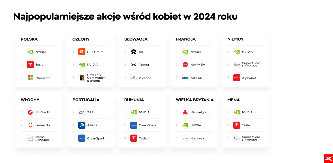 Jeśli chodzi o akcje, Polki częściej inwestują w spółki zagraniczne, zwłaszcza technologiczne. Najpopularniejszymi spółkami wśród polskich inwestorek w 2024 roku były NVIDIA, Tesla i Microsoft. Dla porównania największą popularnością wśród wszystkich inwestorów w 2024 roku cieszyły się akcje Orlen, XTB oraz CD Projekt.