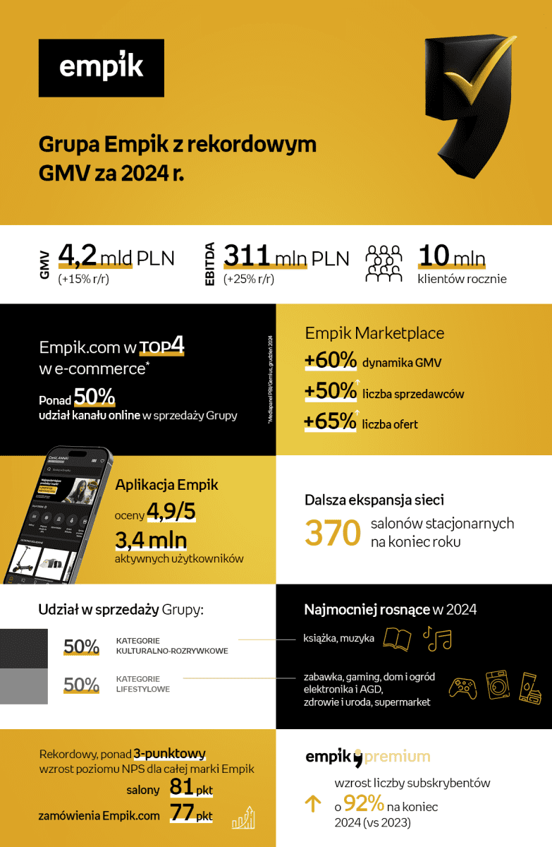 Po raz pierwszy w historii poziom łącznej wartości sprzedaży (GMV) Grupy przekroczył rekordowe 4 mld zł, co oznacza wzrost o 15 proc. względem 2023 roku. Wynik mierzony wskaźnikiem EBITDA osiągnął wartość 311 mln zł, o ponad 25% proc. wyższą w porównaniu z rokiem ubiegłym. Ponadto, nawet z uwzględnieniem nowego finansowania pozyskanego z końcem 2024 roku, utrzymujemy niskie zadłużenie i bardzo dobry standing finansowy. Za nami także silny pierwszy kwartał 2025 r. Tak mocne fundamenty pozwalają nam wrzucić szósty bieg w realizacji naszej strategii i na ten rok prognozujemy jeszcze szybsze tempo wzrostu w ramach wszystkich biznesów z Grupy – tak najważniejsze wskaźniki komentuje Piotr Świątek, członek zarządu i dyrektor finansowy Grupy Empik.