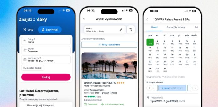 Od czerwca wszyscy klienci internetowego biura podróży eSky mają dostęp do nowej funkcjonalności w aplikacji. Mogą rezerwować pakiety dynamiczne Lot+Hotel na urządzeniach z systemami iOS oraz Android zarówno na city breaki, jak i dłuższe wakacje. To kolejny krok w rozwoju apki eSky 3.0.