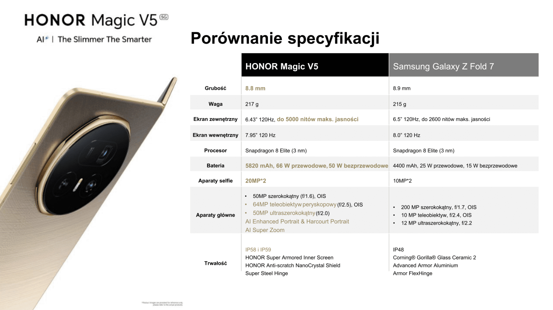 HONOR Magic V5 na nowo definiuje możliwości składanych smartfonów, łącząc wyjątkową smukłość, niezawodną wydajność i innowacyjną technologię baterii. To urządzenie, które wyznacza nowy kierunek w inżynierii mobilnej, spełniając oczekiwania zarówno entuzjastów technologii, jak i profesjonalistów.